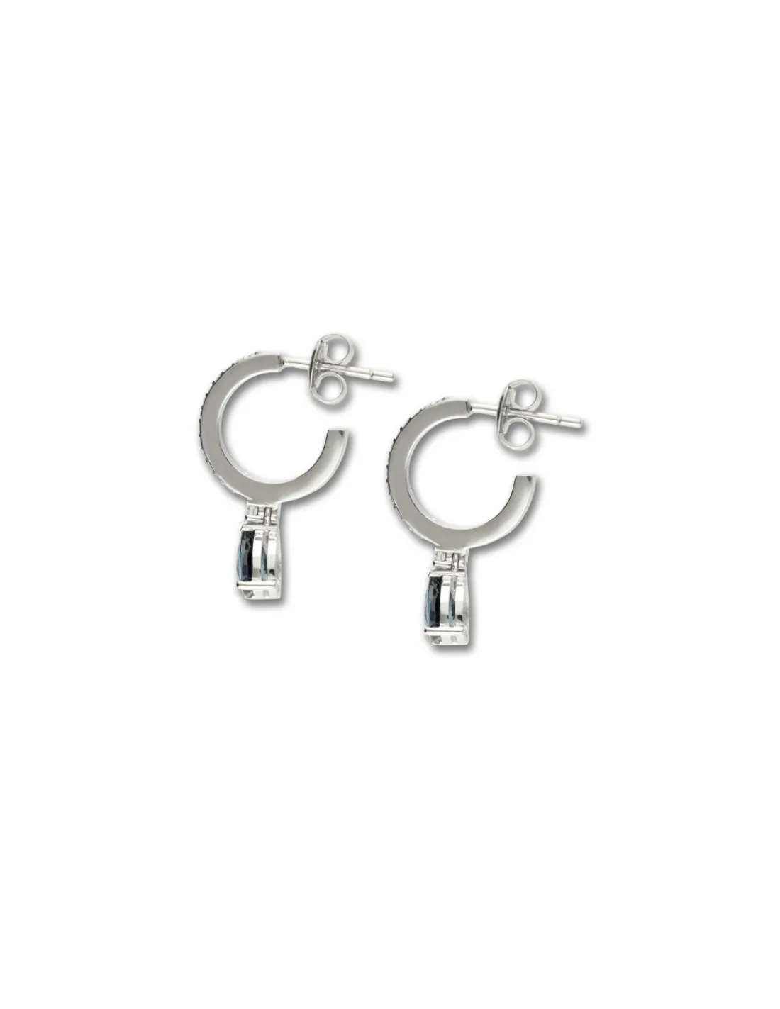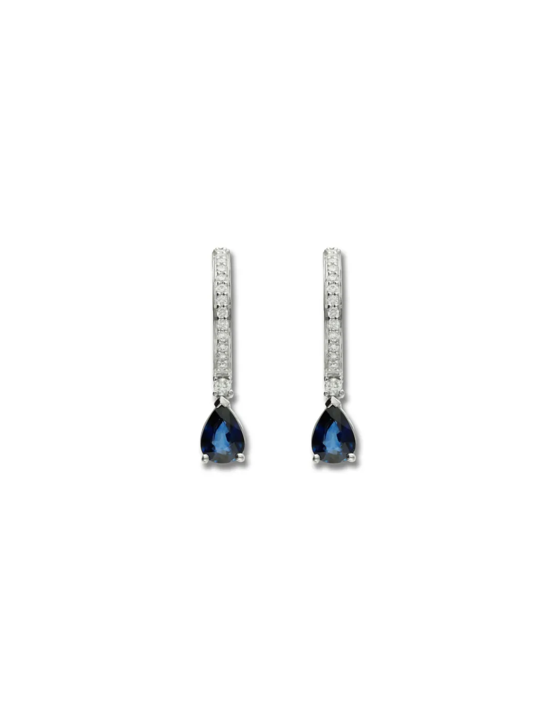 Argollas de oro blanco 1ª Ley (750 mmas) engastadas con diamantes talla brillante de la que cuelga un zafiro talla pera engastado en garras.