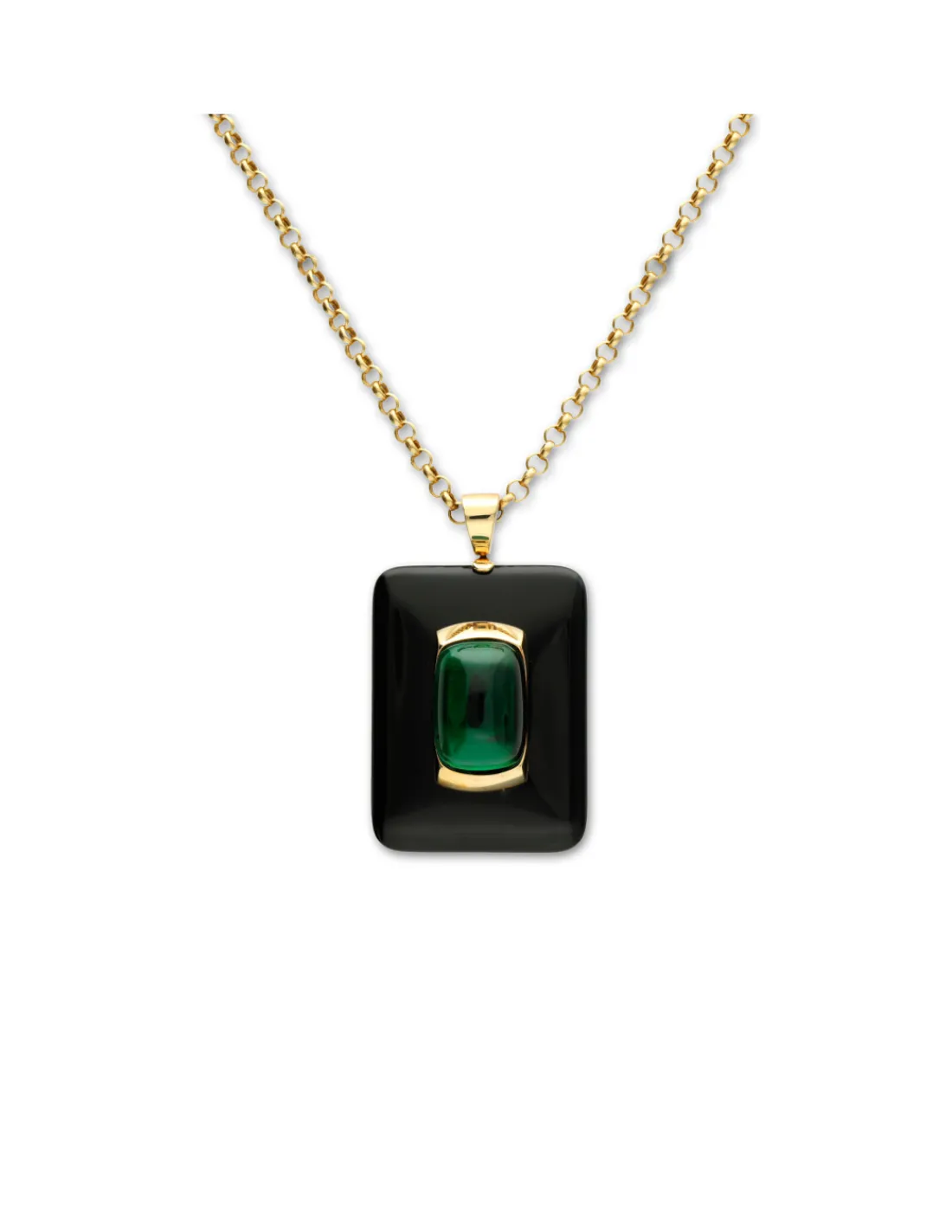Cadena de oro amarillo 1ª Ley (750 mmas) de la que cuelga un colgante de oro amarillo que combina ónix y turmalina verde. Una joya original para las más atrevidas.