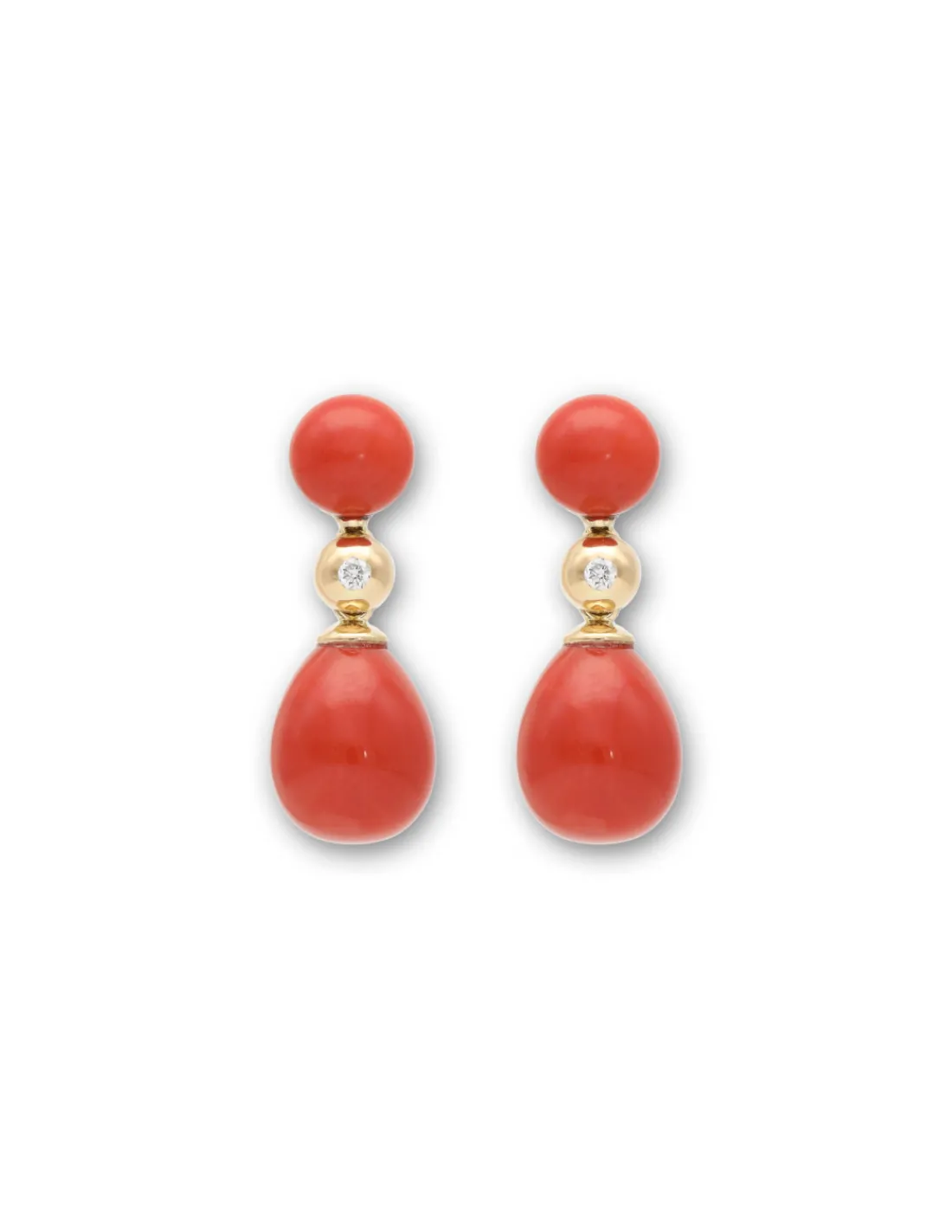 Pendientes de oro amarillo 1ª Ley (750 mmas) con botón de coral, diamante y almendra de coral.