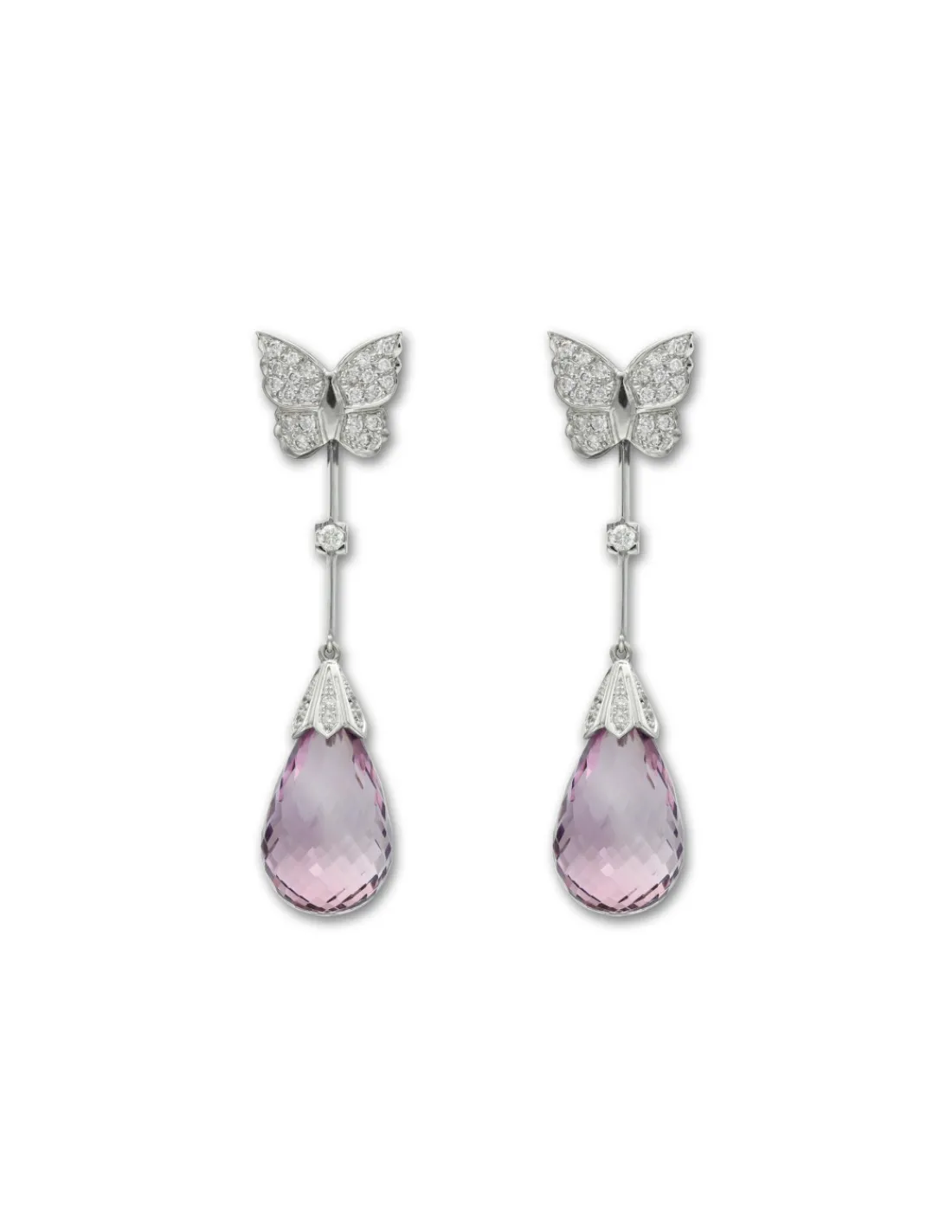 Pendientes de oro blanco 1ª Ley (750 mmas) con diseño de mariposa y diamantes engastados de la que cuelga una barra con movimiento y a su vez una amatista briolette. Cierre de palillo y presión. Largo aproximado 5,3 cm.