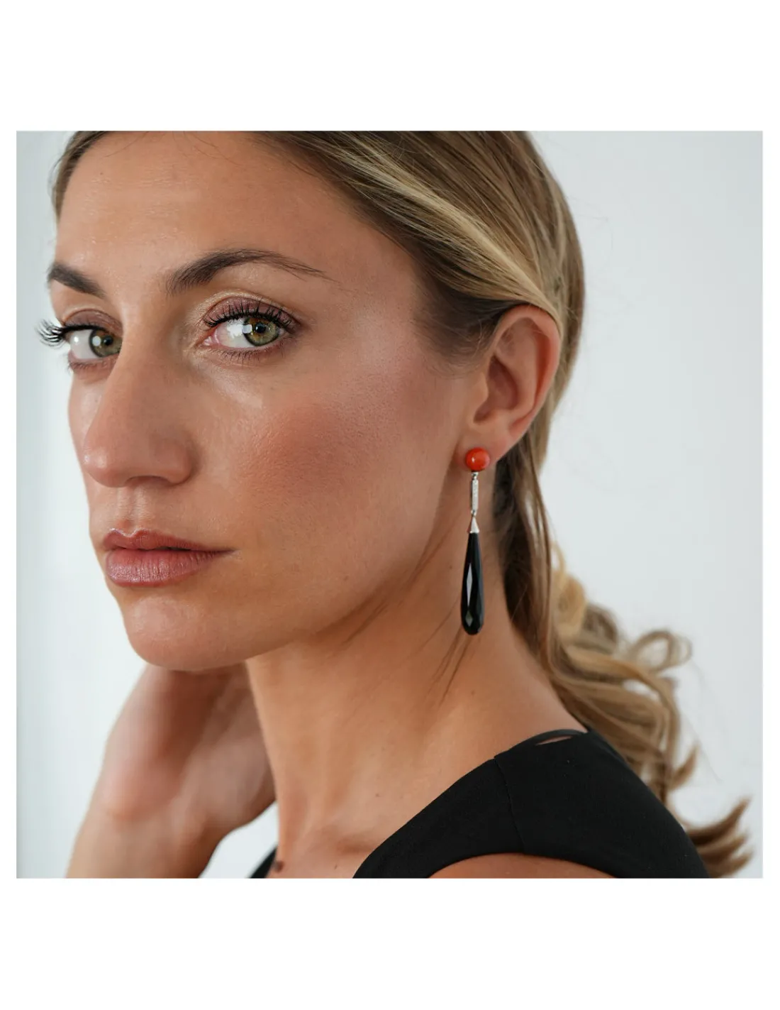 Pendientes de oro blanco 1ª Ley (750 mmas) con un botón de coral del que cuelga una barra rígida engastada con diamantes y a su vez una perilla de ónix. Una joya muy versátil perfecta para invitadas y novias.