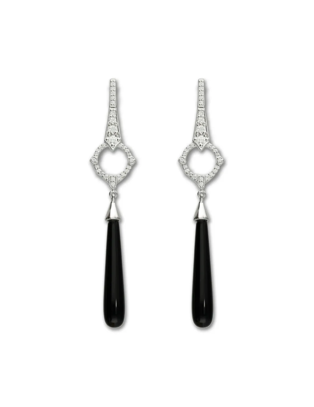Pendientes de oro blanco 1ª Ley (750 mmas) que combina un diseño art deco con diamantes talla brillante y una perilla de onix. El brillo de los diamantes combinado con la elegante lágrima de onix hacen de estos pendientes un espectáculo que los hace únicos.