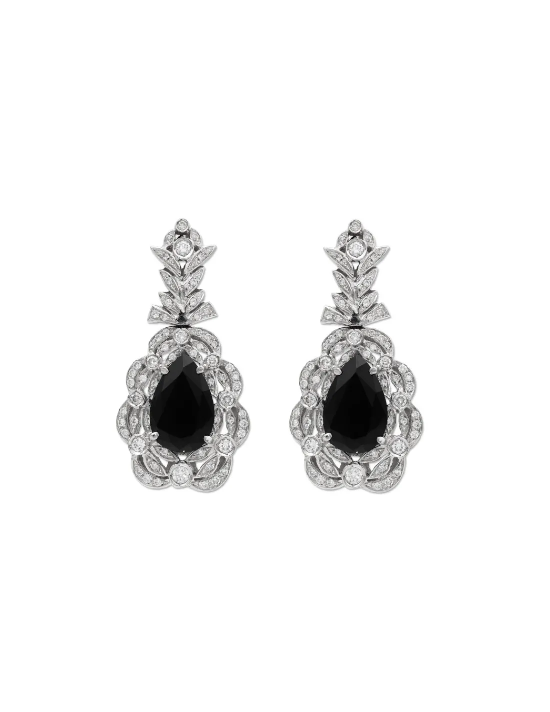 Pendientes de oro blanco 1ª Ley (750 mmas) con diamantes talla brillante y ónix talla pera. Una joya tipo cóctel que irradia luminosidad y transmite un gran valor.