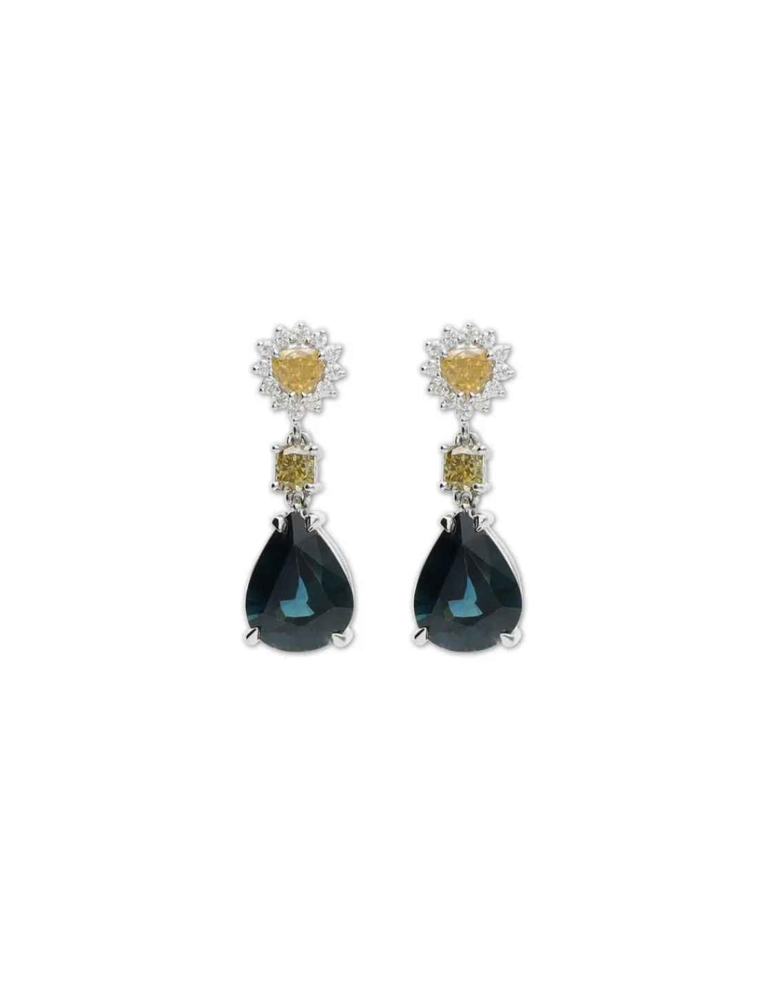 Pendientes de oro blanco 1ª Ley (750 mmas) con un diamante fancy talla pera rodeado de una orla de diamantes de la que cuelga un diamante fancy carré y a su vez un zafiro talla pera. Una pieza original que destaca por sus brillantes piedras y su elegante diseño.