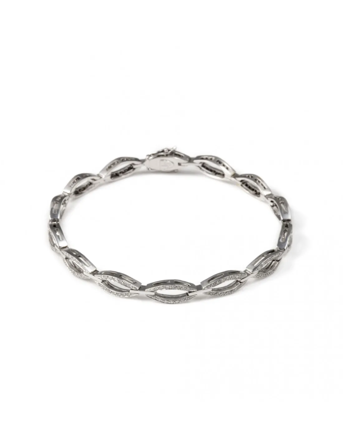 Pulsera de Oro Blanco 1º Ley ( 750 mmas ) con diamantes engastados en grano a lo largo de todo el diseño de finas ondas.