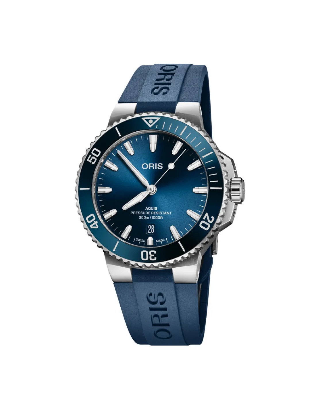 Reloj Oris Aquis Date 01 733 7787 4135-07 4 22 35FC con caja multipiezas de acero inoxidable, esfera azul y correa de caucho. Movimiento automático Swiss Made con 38 horas de reserva de marcha.