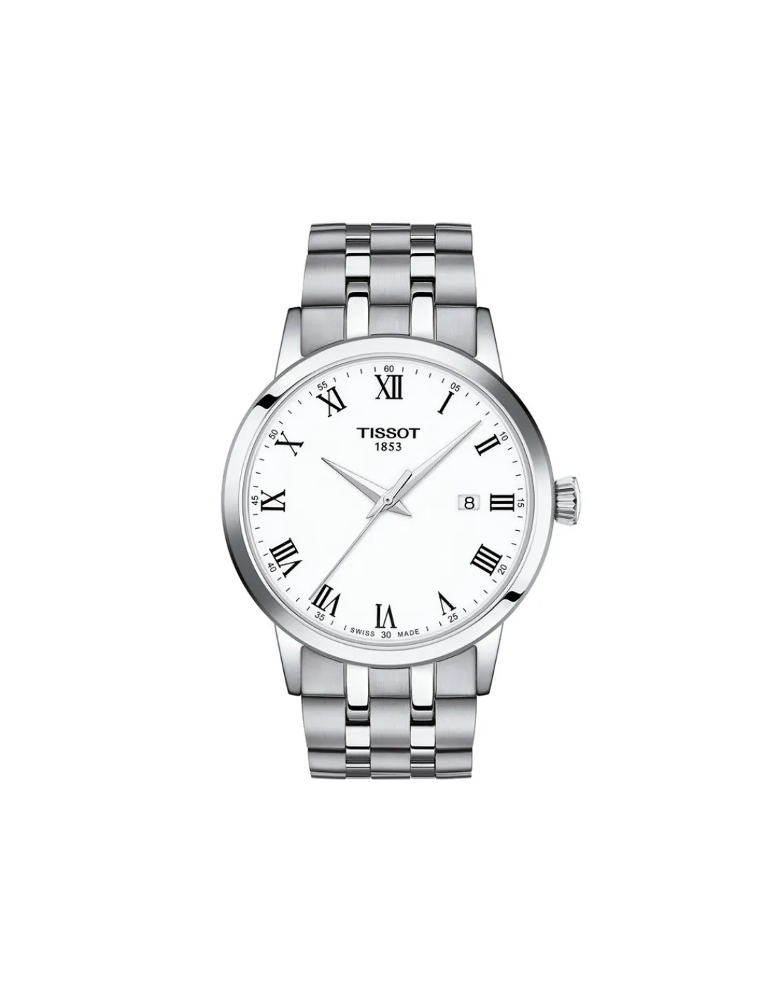 Reloj Tissot Classic Dream T129.410.11.013.00 para hombre con caja de acero, esfera blanca con números romanos y brazalete de acero. Movimiento de cuarzo Swiss Made.