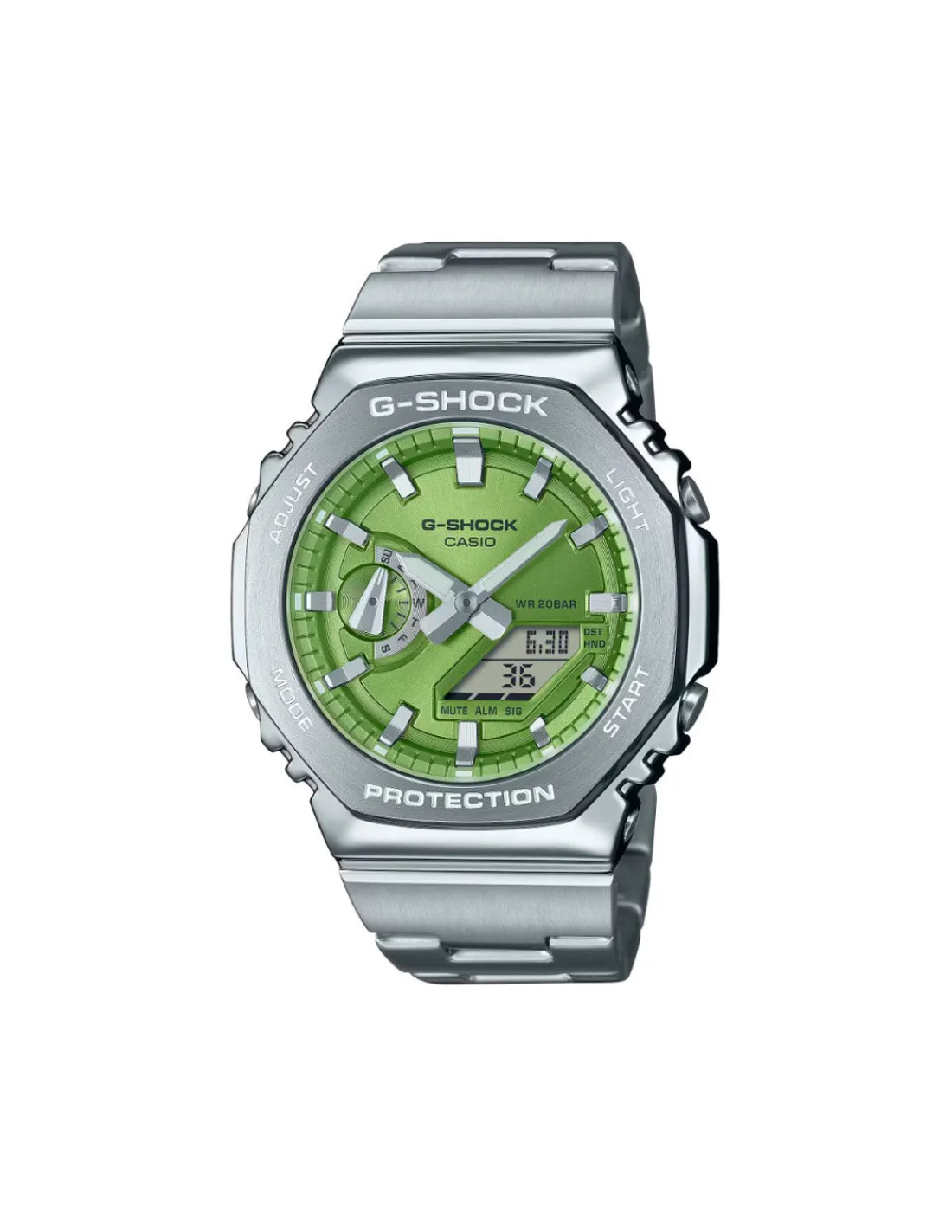 Reloj Casio G-Shock con caja de acero/resina de 44,4 mm de diámetro, bisel de acero inoxidable octogonal, esfera analógica/digital color verde, cristal mineral y brazalete de acero. Movimiento de pila japonés. Sumergible 200 metros. Un reloj deportivo y resistente a los golpes con funciones como iluminación Led, hora mundial, temporizador, cronómetro 1/100 segundos, alarma, calendario, etc.