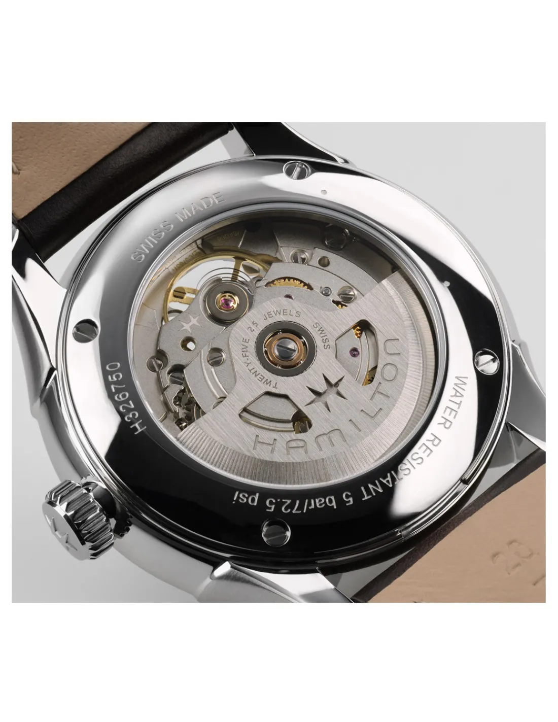 Reloj Hamilton Jazzmaster Open Heart Auto H32675551 para hombre con caja de acero inoxidable, esfera calada blanca y correa de piel de becerro. Movimiento automático Swiss Made con 80 horas de reserva de marcha aproximadamente.