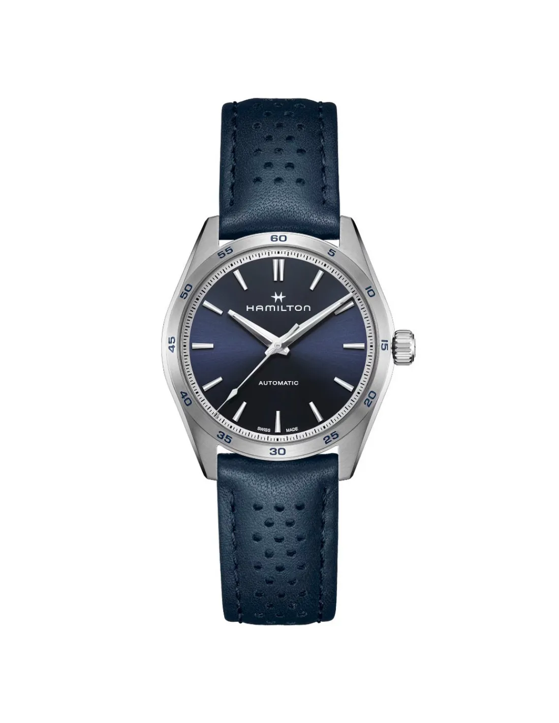 Reloj Hamilton Jazzmaster Performer para hombre con caja de acero de 38 mm, esfera azul y correa de piel de becerro perforada azul. El reloj presenta un estilo deportivo y refinado. Movimiento automático Swiss Made con calibre H-10 y 80 horas de reserva de marcha.