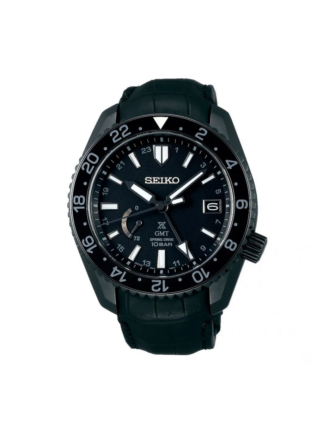 Reloj Seiko Prospex LX para hombre con caja de titanio de 44,8 mm de diámetro, esfera negra y correa de piel de cocodrilo negra. La línea LX es la primera línea de relojes de buceo profesionales de Seiko, una colección de alta gama. Movimiento Spring Drive calibre 5R66 con 72 horas de reserva de marcha.