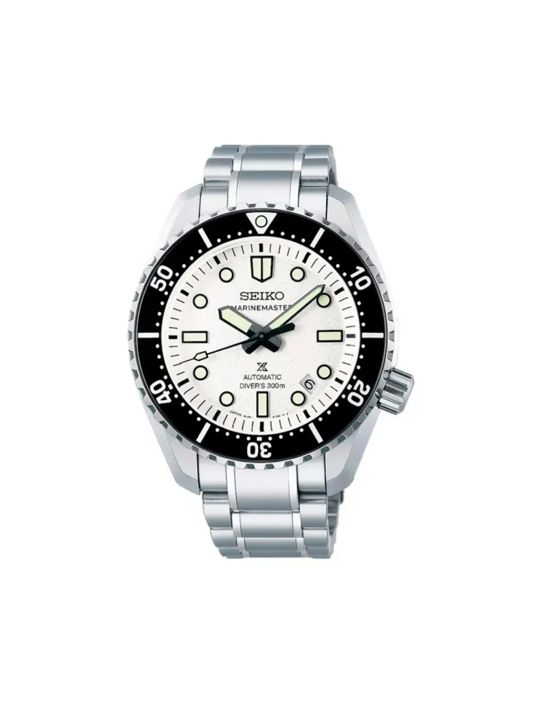 Reloj Seiko Prospex Marinemaster 1968 Heritage Divers Watch con caja de acero de 42,6 mm de diámetro, bisel giratorio unidireccional color negro, esfera blanca con agujas, índices y bisel Lumibrite, cristal de zafiro con doble curvatura y revestimiento antirreflectante en la superficie interna combinado con brazalete. Calibre 8L35. Movimiento automático con 50 horas de reserva de marcha aproximadamente.