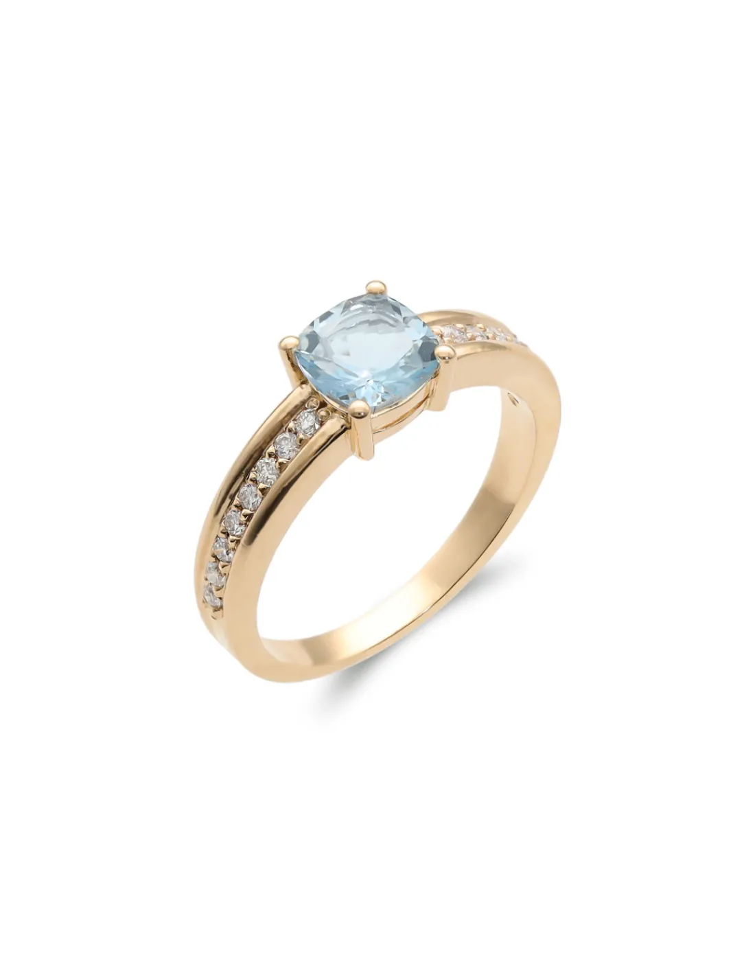 Anillo de oro amarillo 1ª Ley (750 mmas) con aguamarina talla cushion engastada en cuatro garras acompañada de diamantes talla brillante a cada lado. Talla 12.