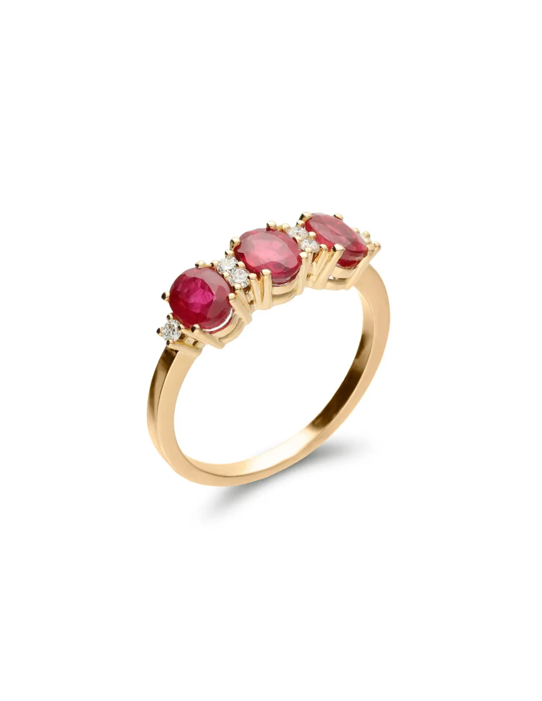 Anillo de oro amarillo 1ª Ley (750 mmas) con tresillo de rubíes ovales engastados en cuatro garras acompañados de diamantes naturales talla brillante. Una pieza llamativa que aporta claridad y destaca por sus elegantes y brillantes piedras rojas. Talla 12.