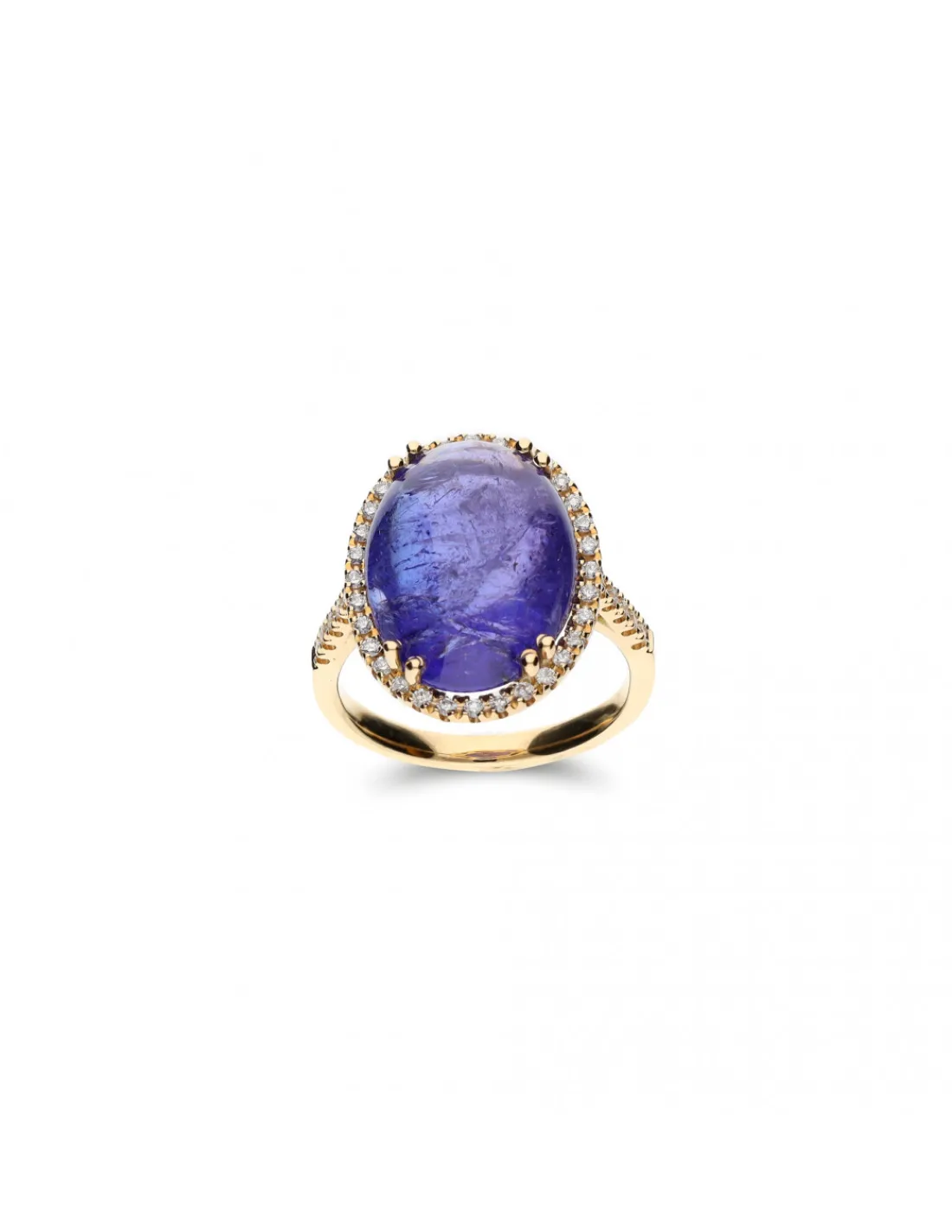 Anillo de oro amarillo 1ª Ley (750 mmas) con tanzanita en el centro rodeada de diamantes.