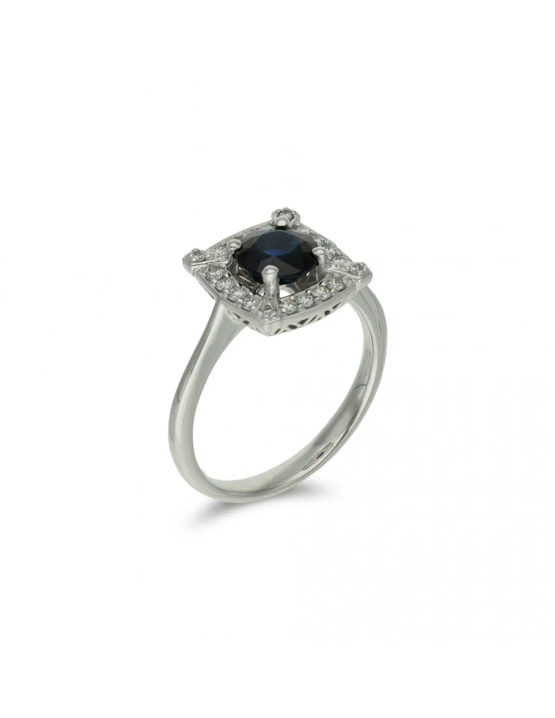 Anillo de oro blanco 1ª Ley (750 mmas) con zafiro redondo en el centro y diamantes alrededor.