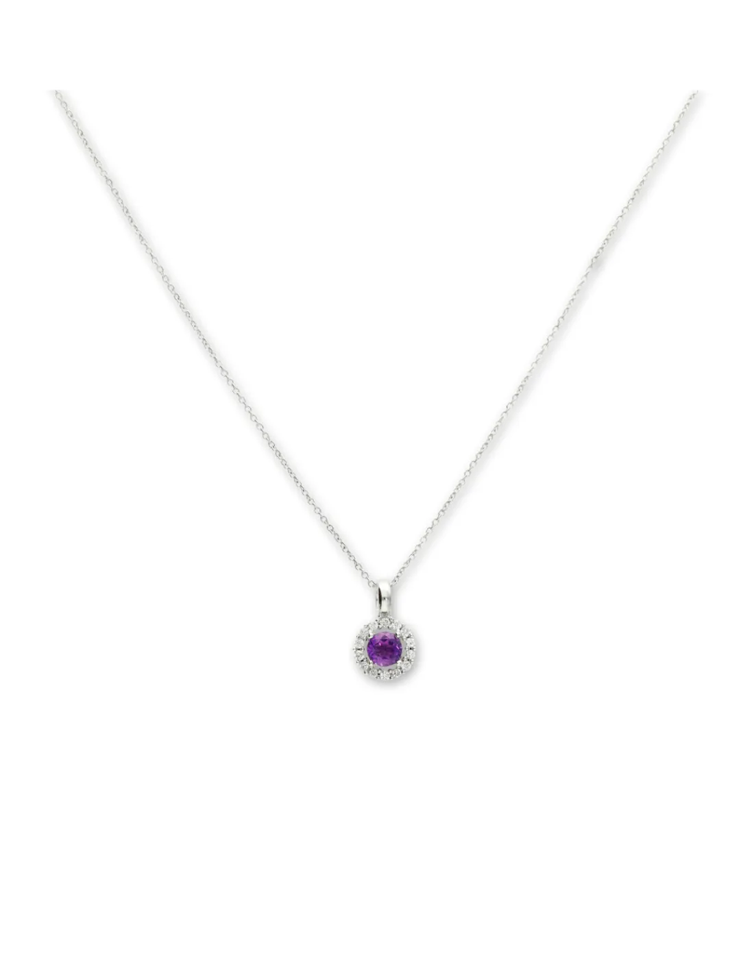 Cadena-Colgante de oro blanco 1ª Ley (750 mmas) con amatista redonda y diamantes talla brillante. Una joya ideal para el día a día.