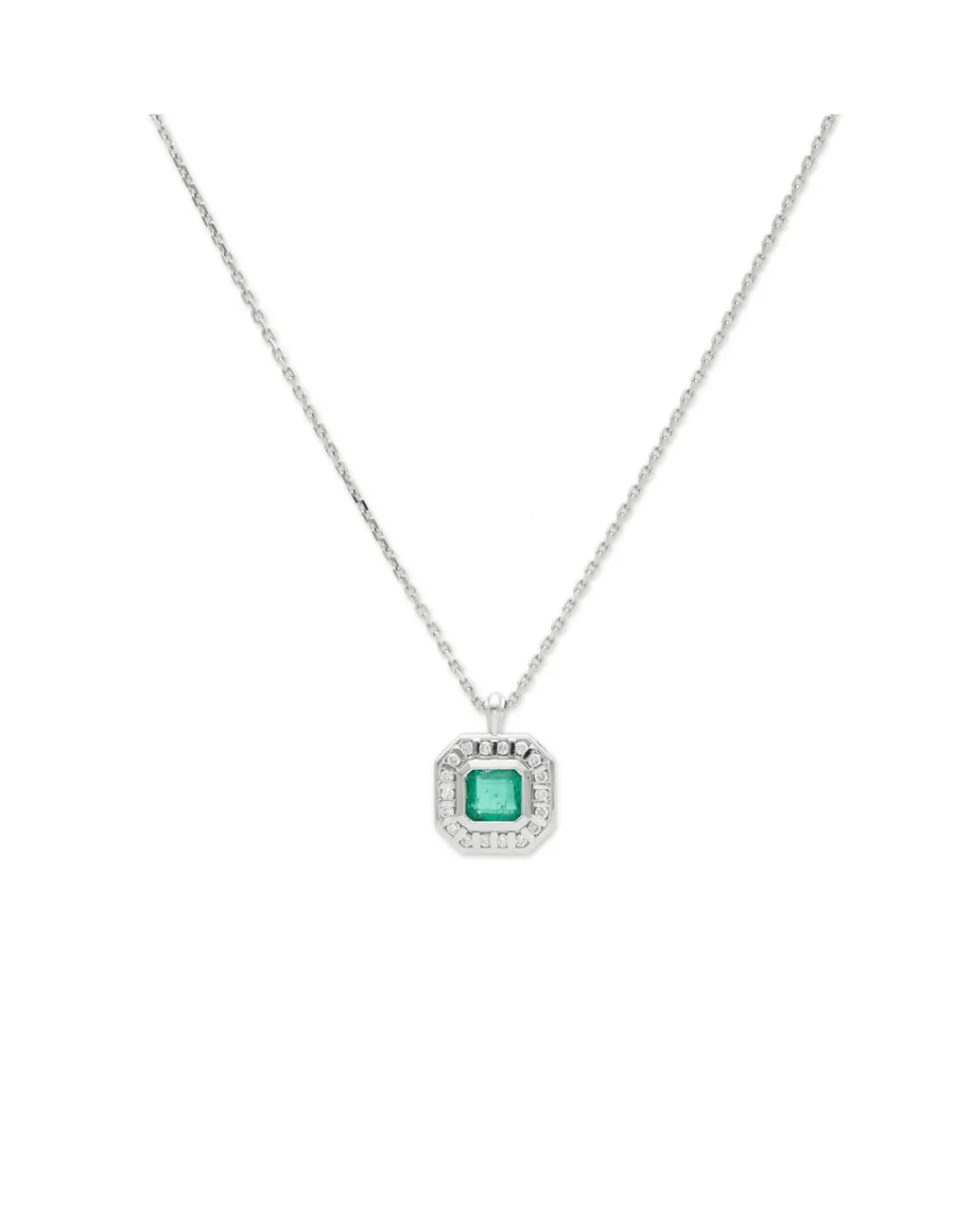Cadena-Colgante de oro blanco 1ª Ley (750 mmas) con esmeralda cuadrada engastada en boquilla combinada con diamantes talla brillante. Longitud cadena 42,5 cm. Tamaño del colgante incluyendo reasa 1,2 cm.