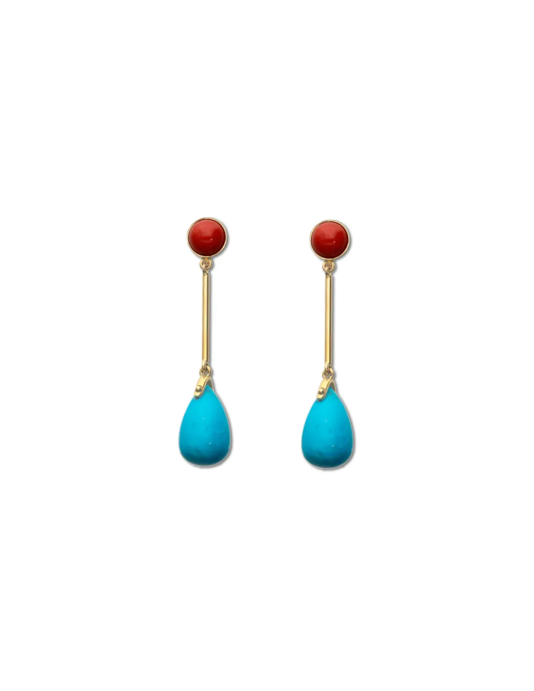 Pendientes de oro amarillo 1ª Ley (750 mmas) con boton de coral del que cuelga una barra rígida y una turquesa talla pera. Largo aproximado 3,9 cm. Cierre de palillo y presión.
