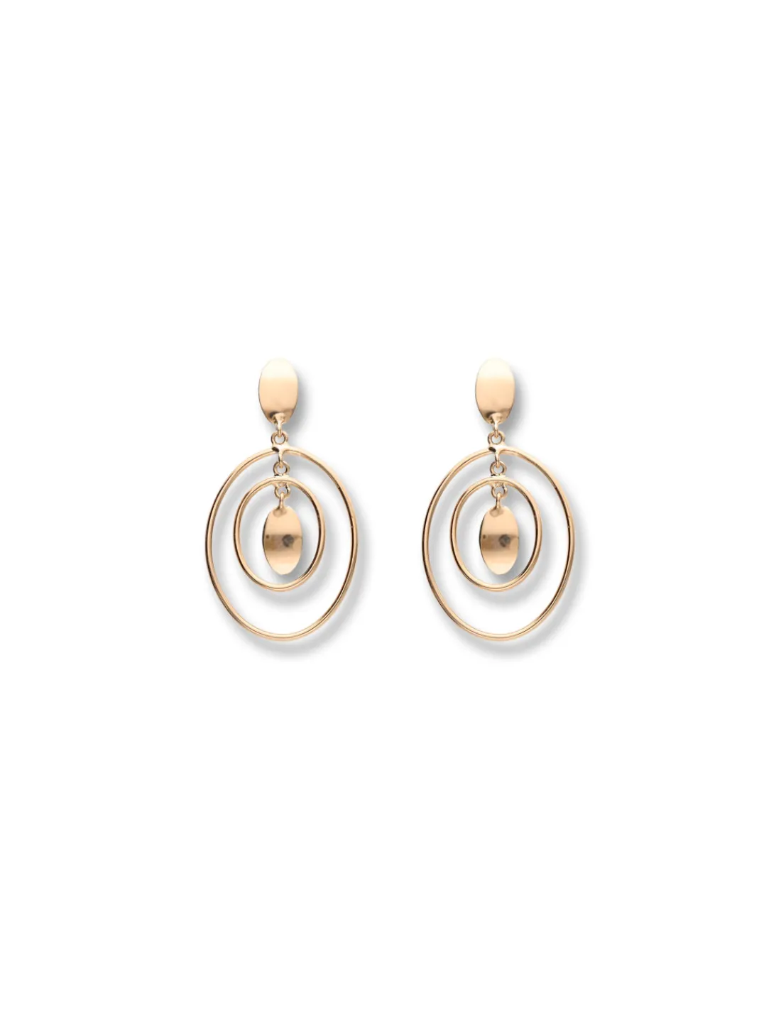 Pendientes de oro amarillo 1ª Ley (750 mmas) con dijes ovalados y círculos. Un diseño con discreta elegancia perfecto para cualquier ocasión.