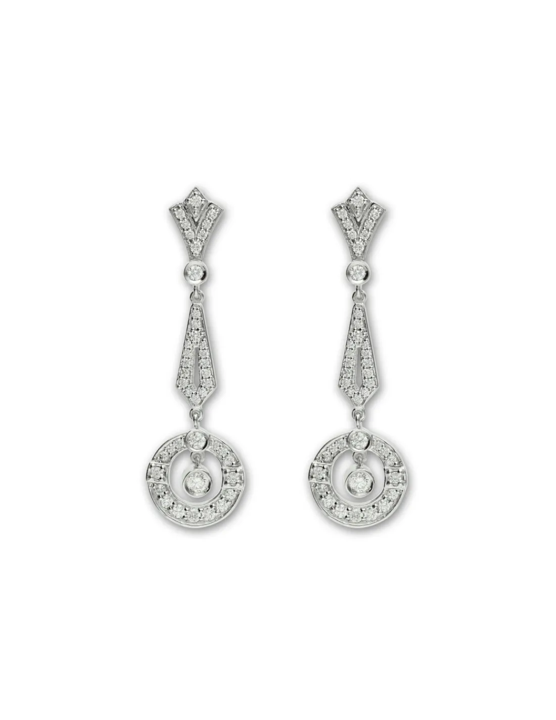 Pendientes de oro blanco 1ª Ley (750 mmas) con aspecto vanguardista y diamantes talla brillante engastados. Una joya radiante para novias o invitadas.