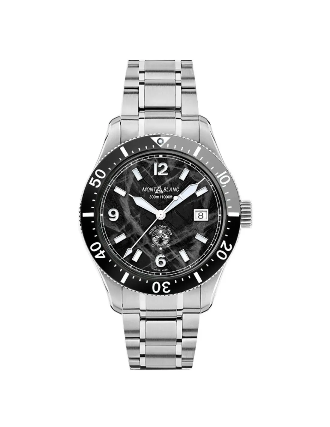 Reloj Montblanc 1858 Iced Sea Automatic date para hombre con caja de 41 mm, brazalete de acero y esfera negra con motivo de glaciar que se inspira en el Mer de Glace (Mar de Hielo). Diseño de buceo deportivo con bisel de cerámica bicolor y tapa trasera grabada. Movimiento automático Swiss Made.