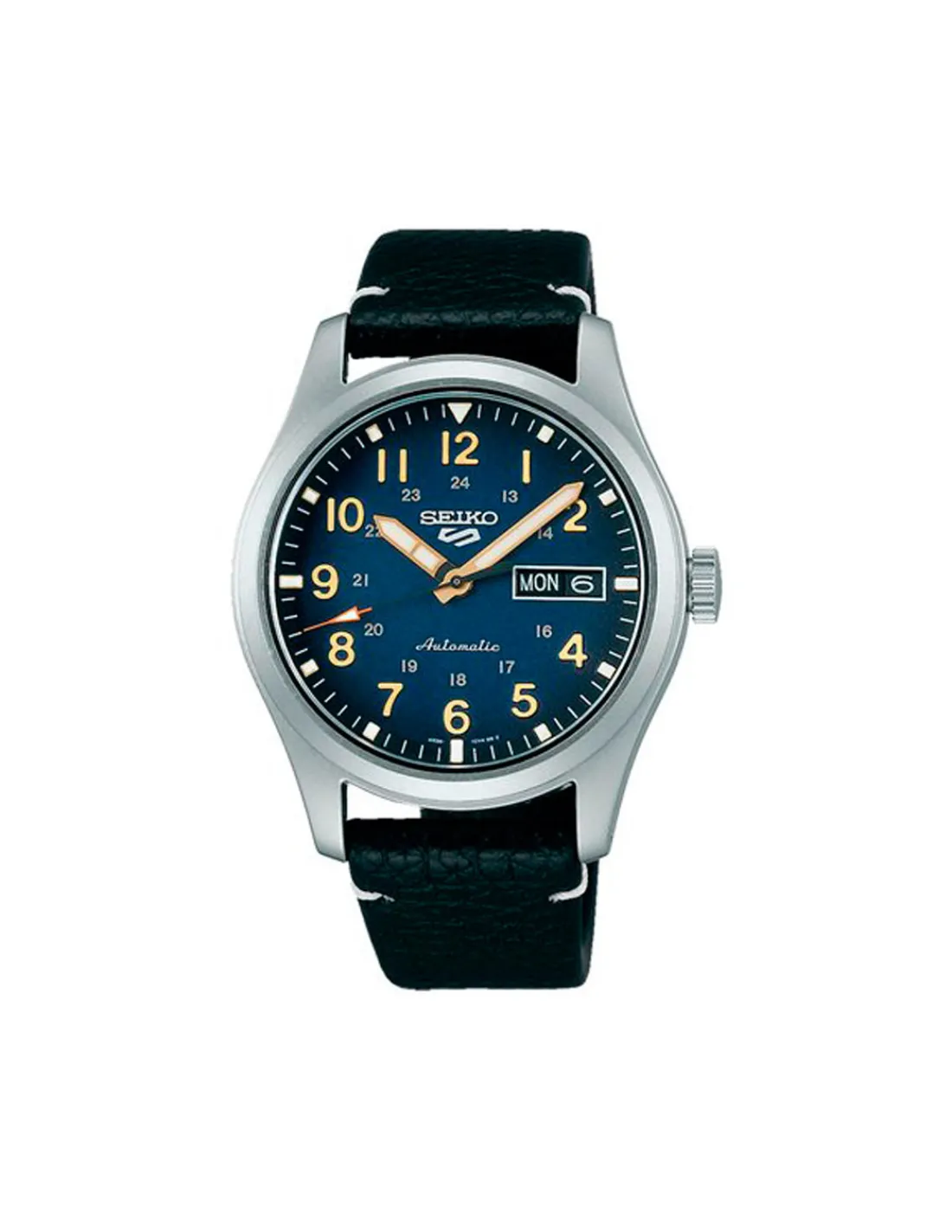 Reloj Seiko 5 Sports Field Military Specialist SRPG39K1 para hombre con caja de acero, esfera azul y correa de piel negra. Movimiento automático.