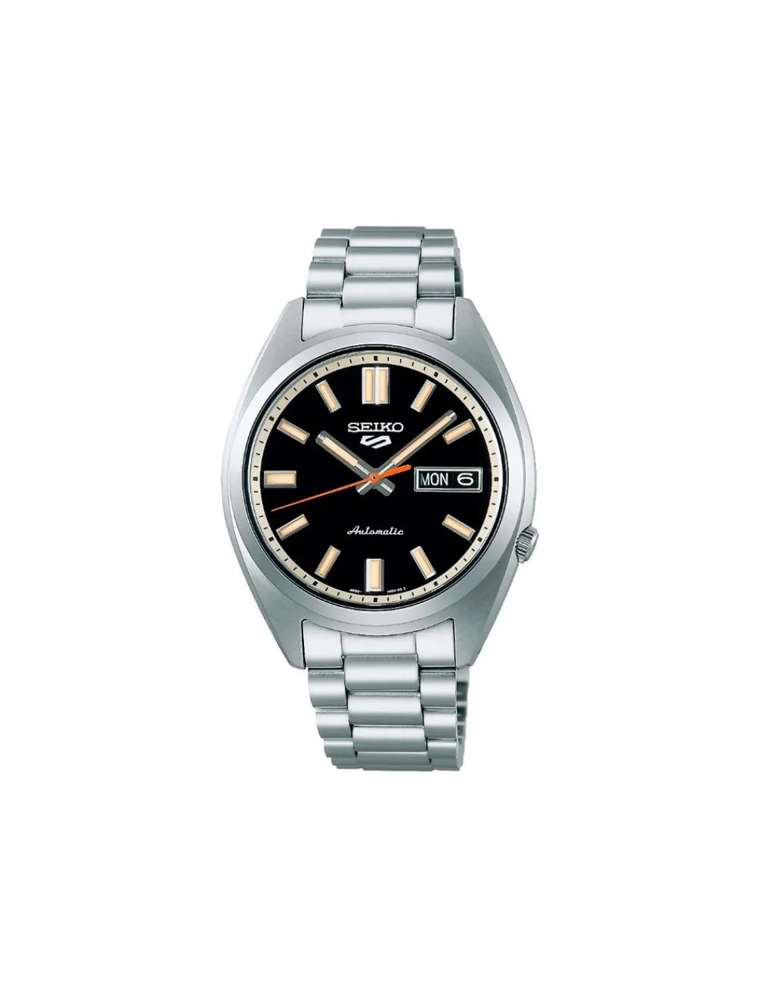 Reloj Seiko 5 Sports SNXS series con caja de de acero inoxidable de 37,4 mm de diámetro, esfera color negro con Lumibrite en agujas e índices, cristal de Hardlex curvado y brazalete de acero. Calibre 4R36. Movimiento automático con 41 horas de reserva de marcha aproximadamente.