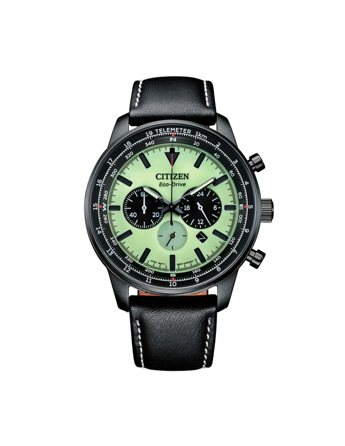 Reloj Citizen Chrono Aviation Eco Drive para hombre con caja de acero de 44 mm de diámetro, esfera amarilla con agujas y marcas luminous, cristal mineral esférico y correa de piel negra. Cronógrafo 60 minutos a 1/5 de segundo. Movimiento Eco Drive B620 con reserva de carga 9 meses.