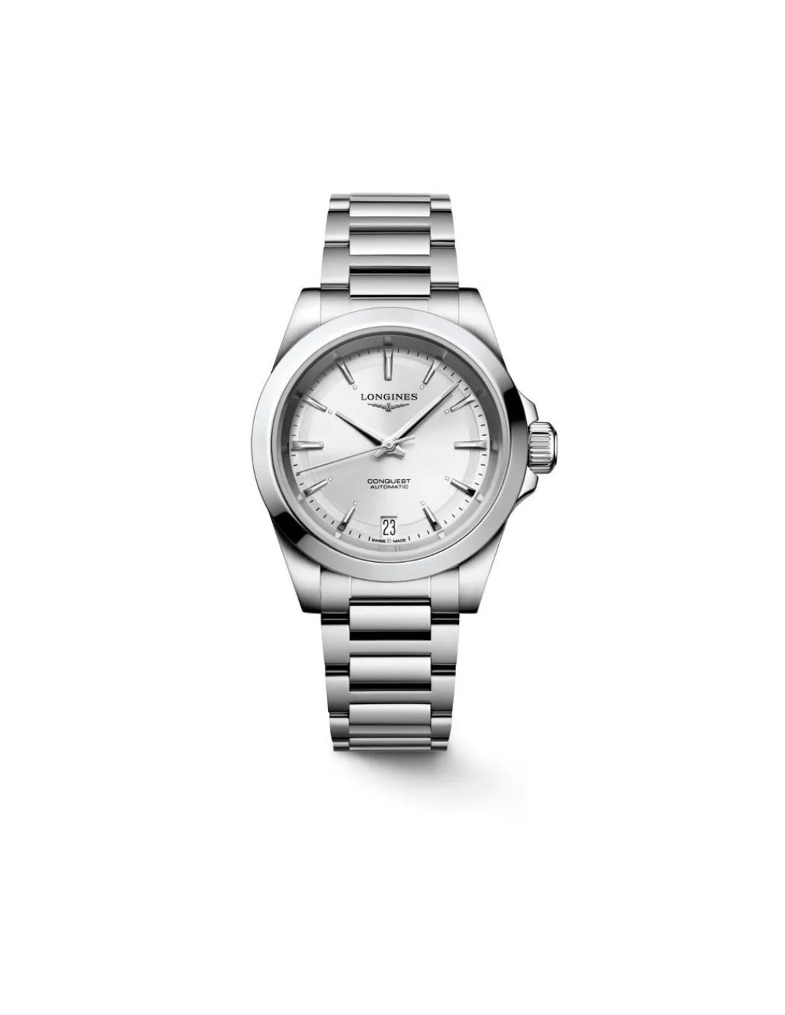 Reloj Longines Conquest para mujer con caja de acero de 34 mm, esfera plateada con efecto rayos de sol con índices aplicados y agujas plateadas pulidas Super-LumiNova, cristal de zafiro resistente a los arañazos combinado con brazalete de acero. Movimiento automático Swiss Made calibre L888 y 72 horas de reserva de marcha.