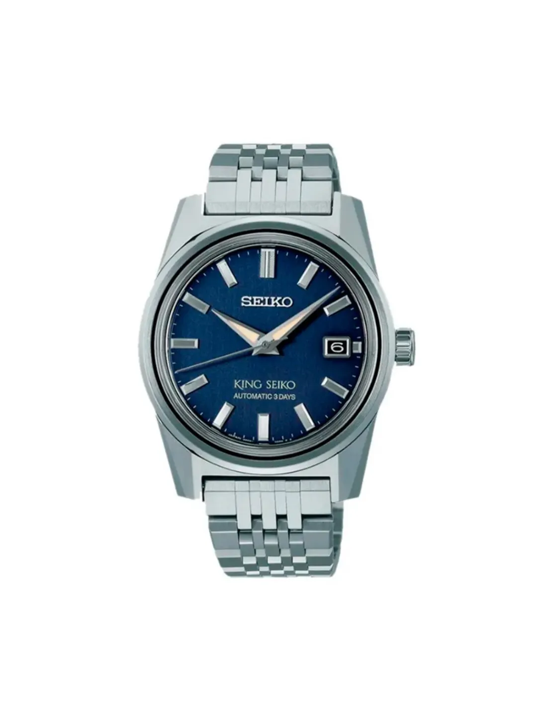 Reloj King Seiko con caja de acero de 38,3 mm de diámetro, esfera azul, cristal de zafiro con revestimiento antirreflectante en la superficie interna y brazalete de acero. Movimiento automático calibre 6R55 con 72 horas aproximadamente de reserva de marcha.