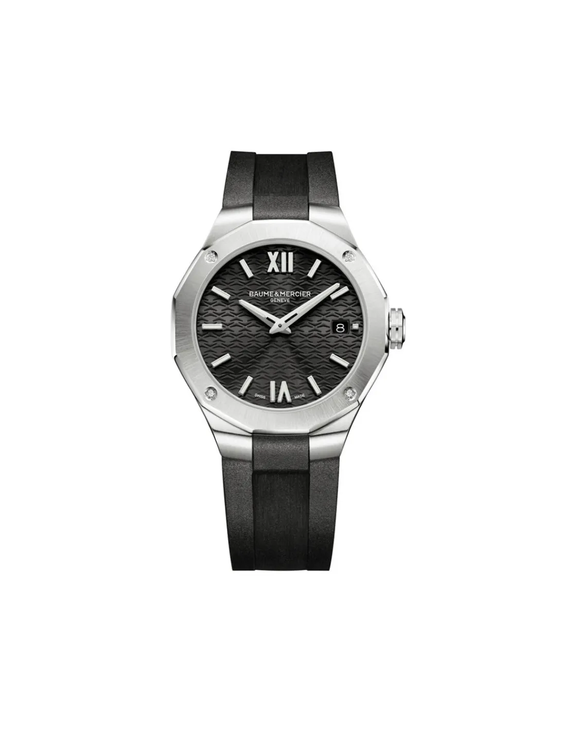 Reloj Baume et Mercier Riviera con caja de acero de 36 mm y lujoso bisel dodecagonal con cuatro diamantes, esfera color negro satinado y correa de caucho negra. Un reloj idóneo para fuertes personalidades con movimiento de cuarzo Swiss Made.
