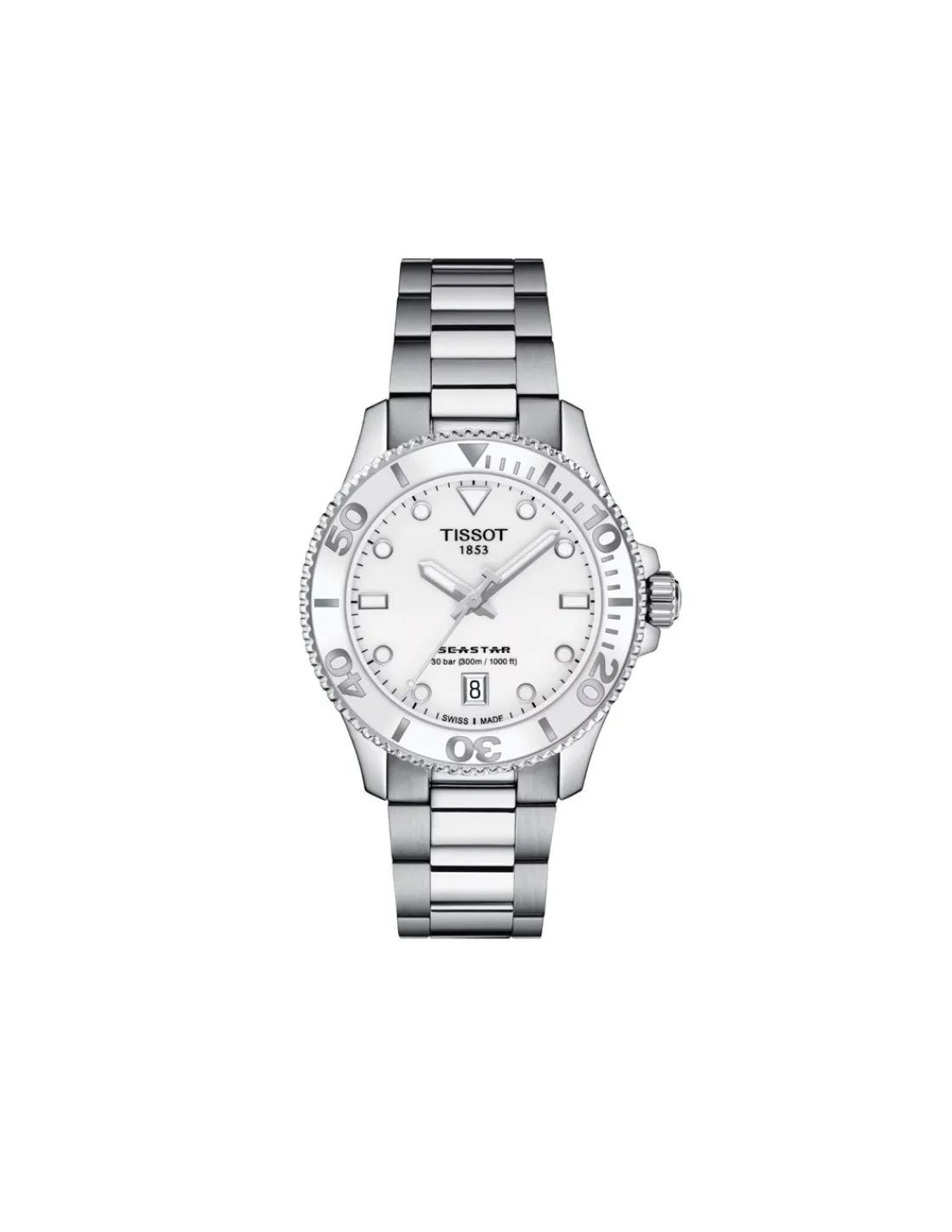 Reloj Tissot Seastar 1000 T120.210.11.011.00 para mujer con caja de acero, esfera blanca con agujas e índices superluminova y brazalete de acero. Un reloj elegante y versátil con movimiento de cuarzo Swiss Made.