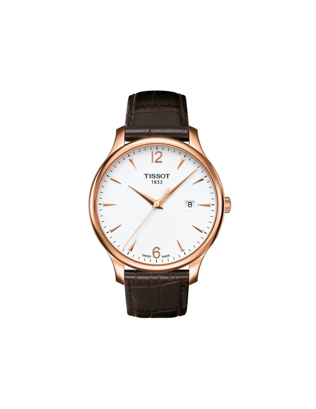 Reloj Tissot T-Classic Tradition T063.610.36.037.00 para hombre con caja de acero y PVD de oro rosa, esfera blanca y correa de piel marrón con aspecto de caimán. Movimiento de cuarzo Swiss Made.