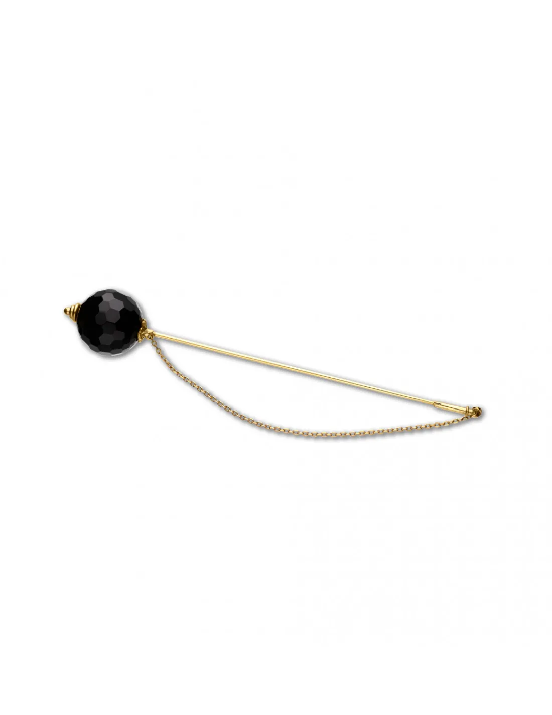Alfiler de oro amarillo 1ª Ley (750 mmas) y ónix redondo talla briolette con cierre de seguridad de cadena y tapón. Una joya para mujeres que se sientan atraidas por joyas originales.