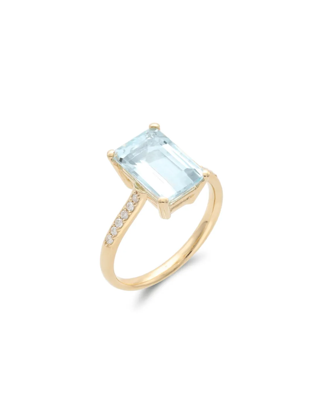 Anillo de oro amarillo 1ª Ley (750 mmas) con aguamarina y diamantes. Una joya con un diseño fresco y sutiles destellos azulados.