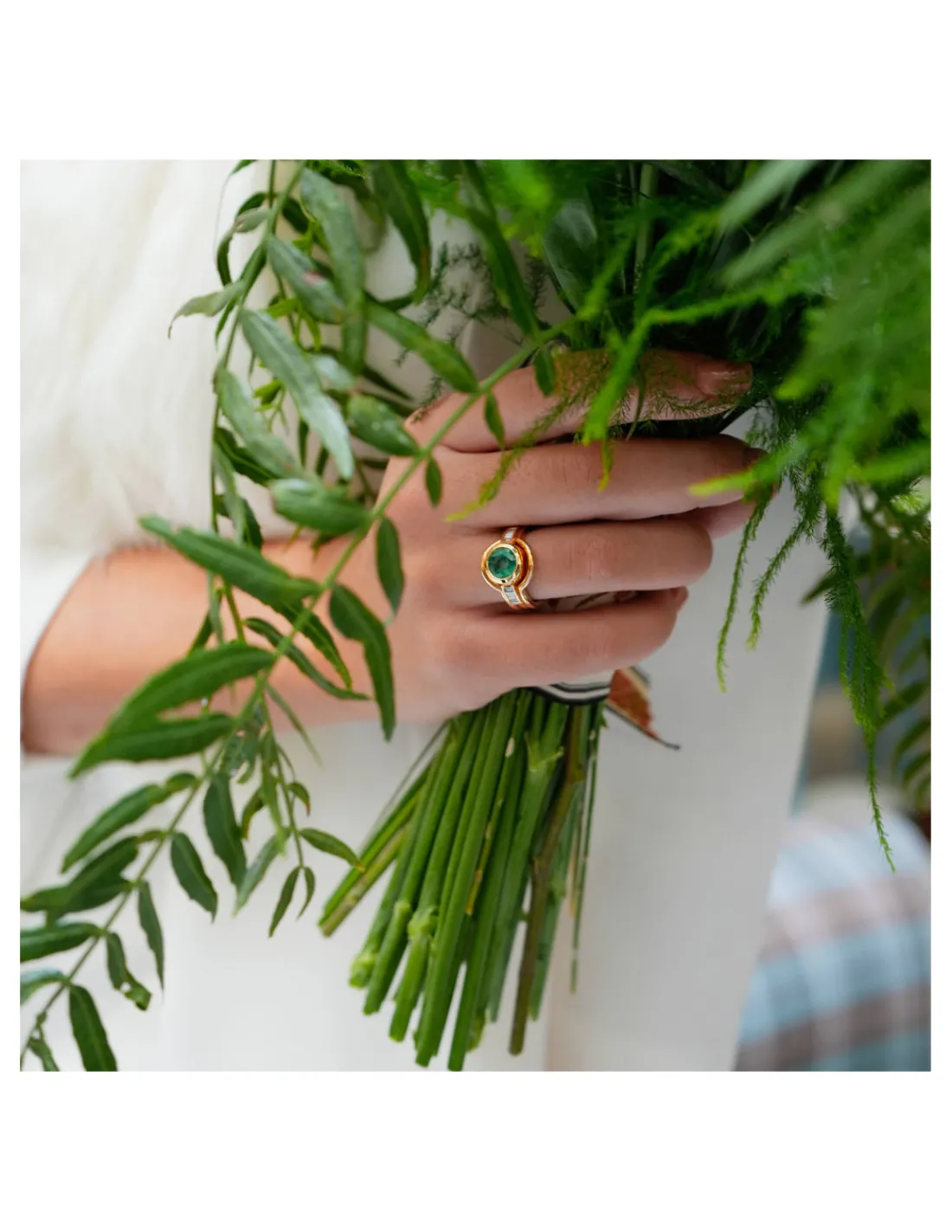 Anillo de oro amarillo 1ª Ley (750 mmas) con esmeralda y diamantes naturales. Una pieza diferente con un diseño atrevido que la hace única.