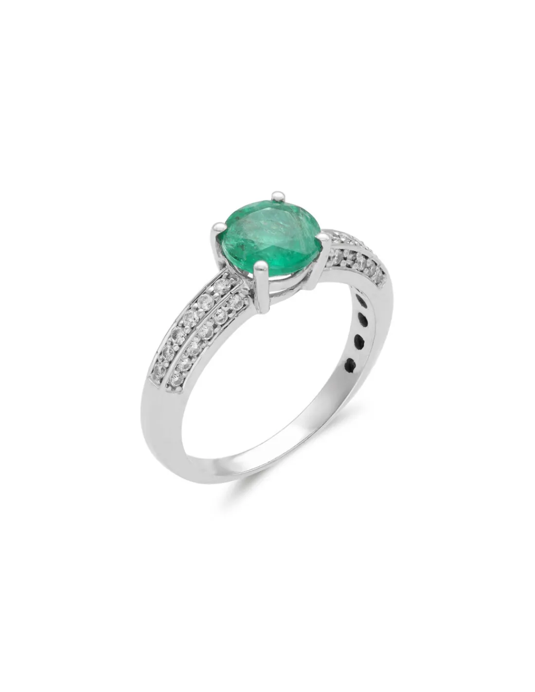 Anillo de oro blanco 1ª Ley (750 mmas) con una esmeralda redonda engastada en cuatro garras acompañada de diamantes talla brillante a cada lado. Talla 13.