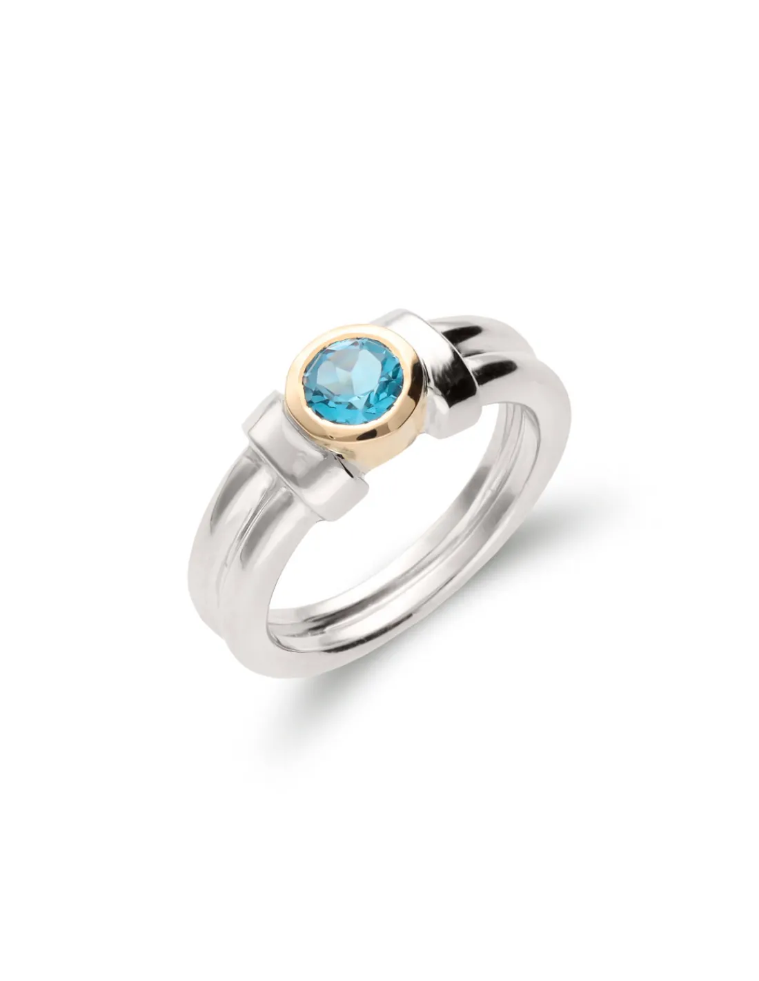 Anillo de plata 1ª Ley (925 mmas) combinado con boquilla de oro amarillo de 9 kt (375 mmas) y una piedra azul central. Una joya con diseño atemporal.