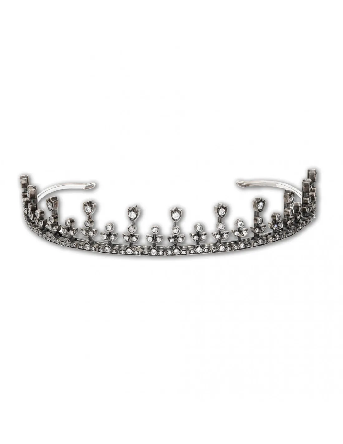 Diadema de plata 1ª Ley (925 mmas) con circonitas engastadas en pequeños tulipanes. El complemento ideal para novias clásicas que buscan una pieza bien hecha que pase de generación en generación.