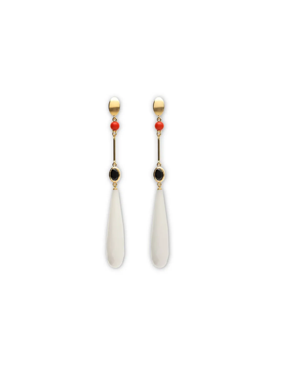 Pendientes de oro amarillo 1ª Ley (750 mmas) con bola de coral, ónix oval y lágrima de ágata facetada. Una joya elegante y original.