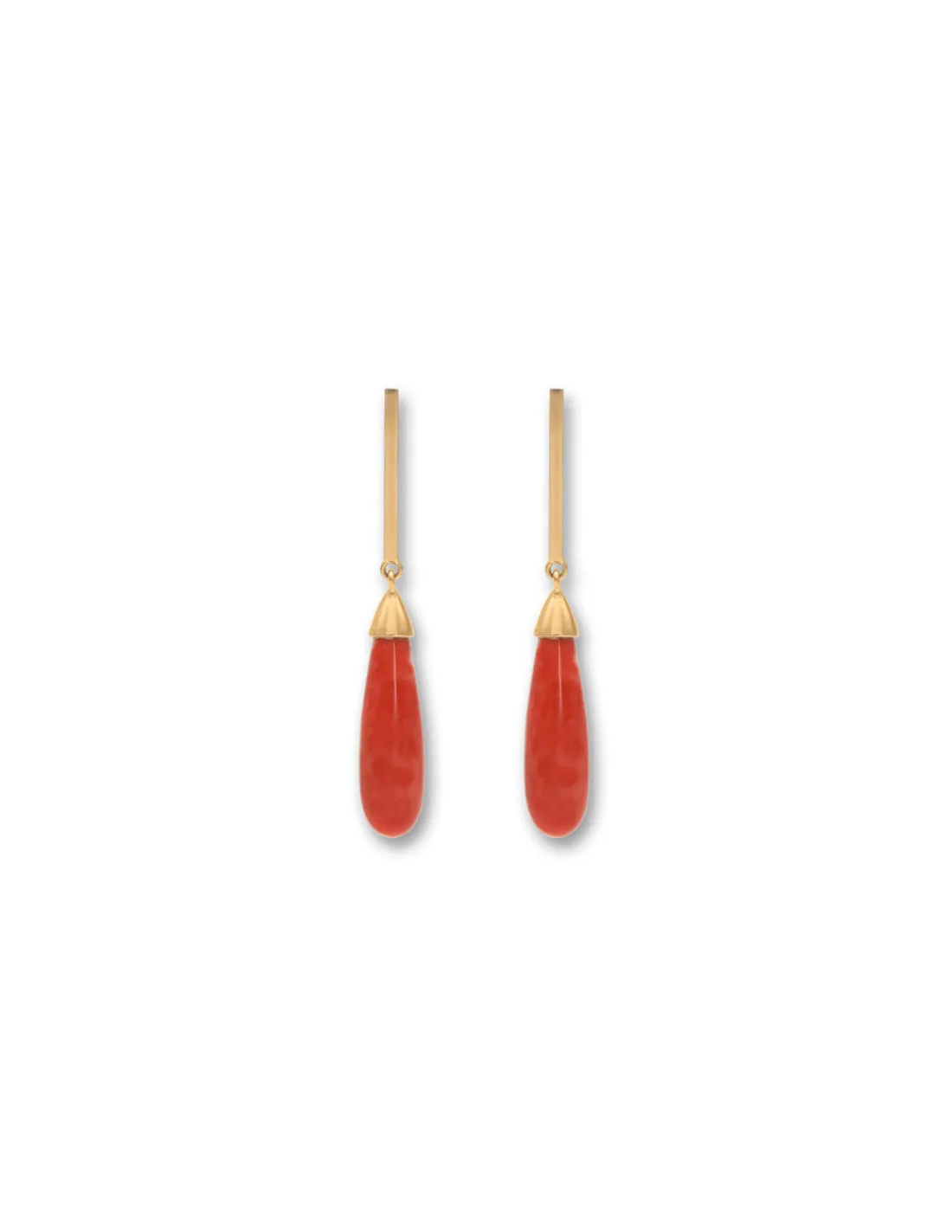Pendientes de oro amarillo 1ª Ley (750 mmas) con barra rígida de la que cuelga una perilla de coral.