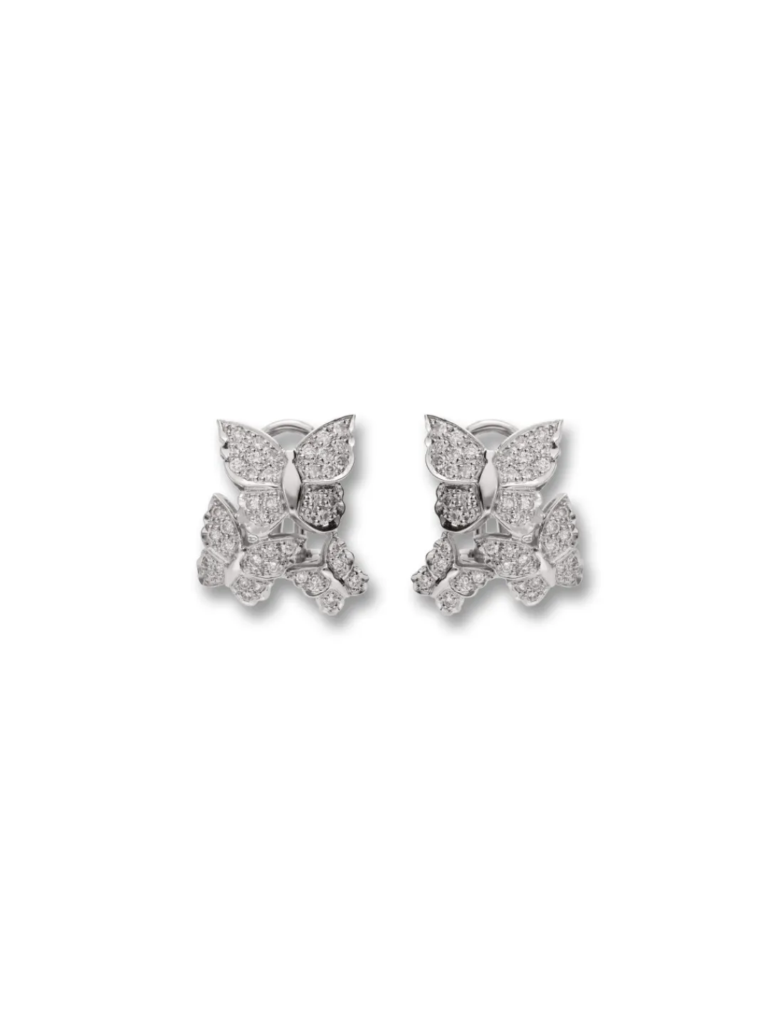 Pendientes de oro blanco 1ª Ley (750 mmas) con diseño de mariposas y diamantes talla brillante engastados en grano. Una pieza única que crea un efecto de formas y luz.