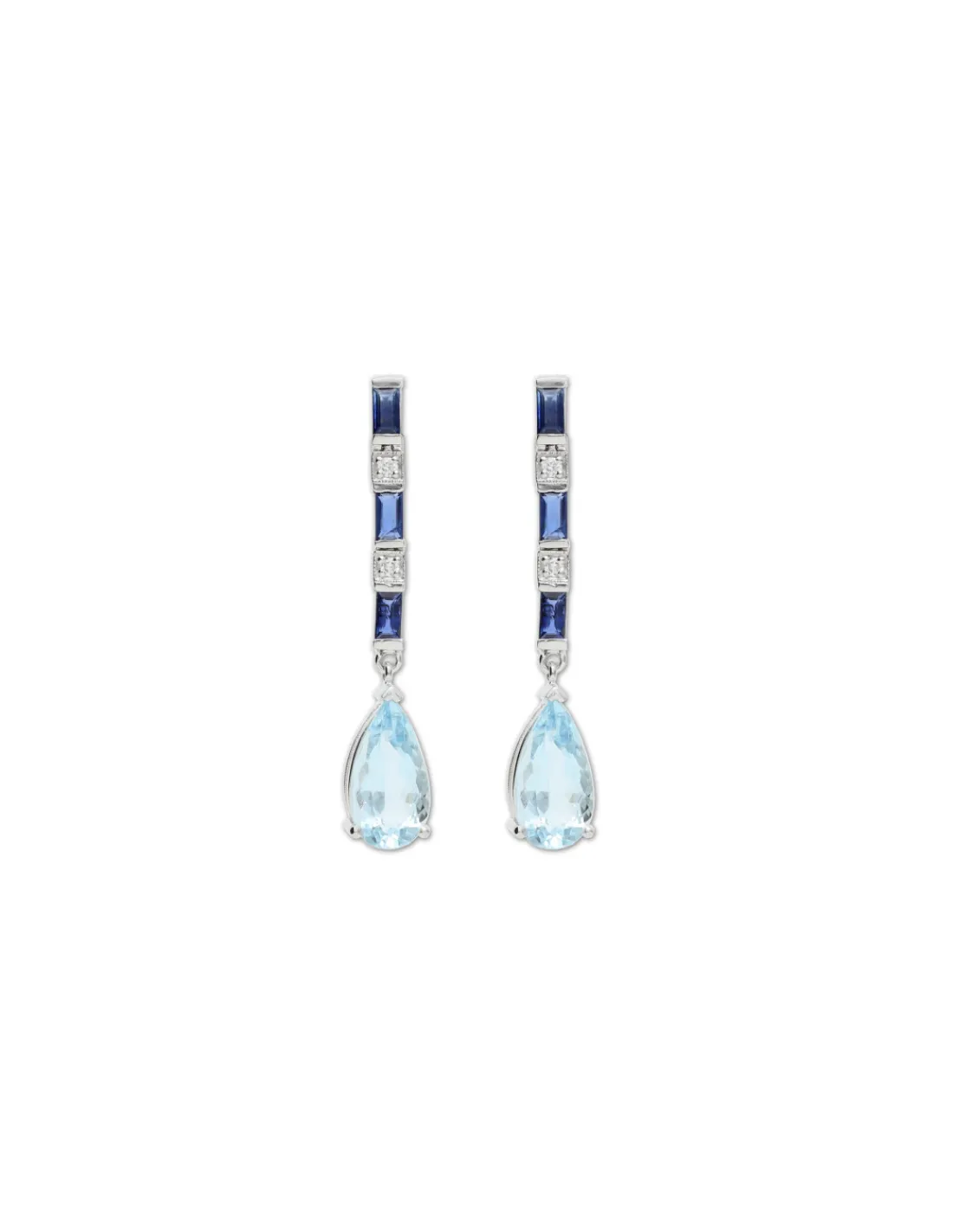 Pendientes de oro blanco 1ª Ley (750 mmas) con zafiros talla baguette, diamantes talla brillante y aguamarina talla pera. Cierre de palillo y presión. Tamaño aproximado 3,7 cm.