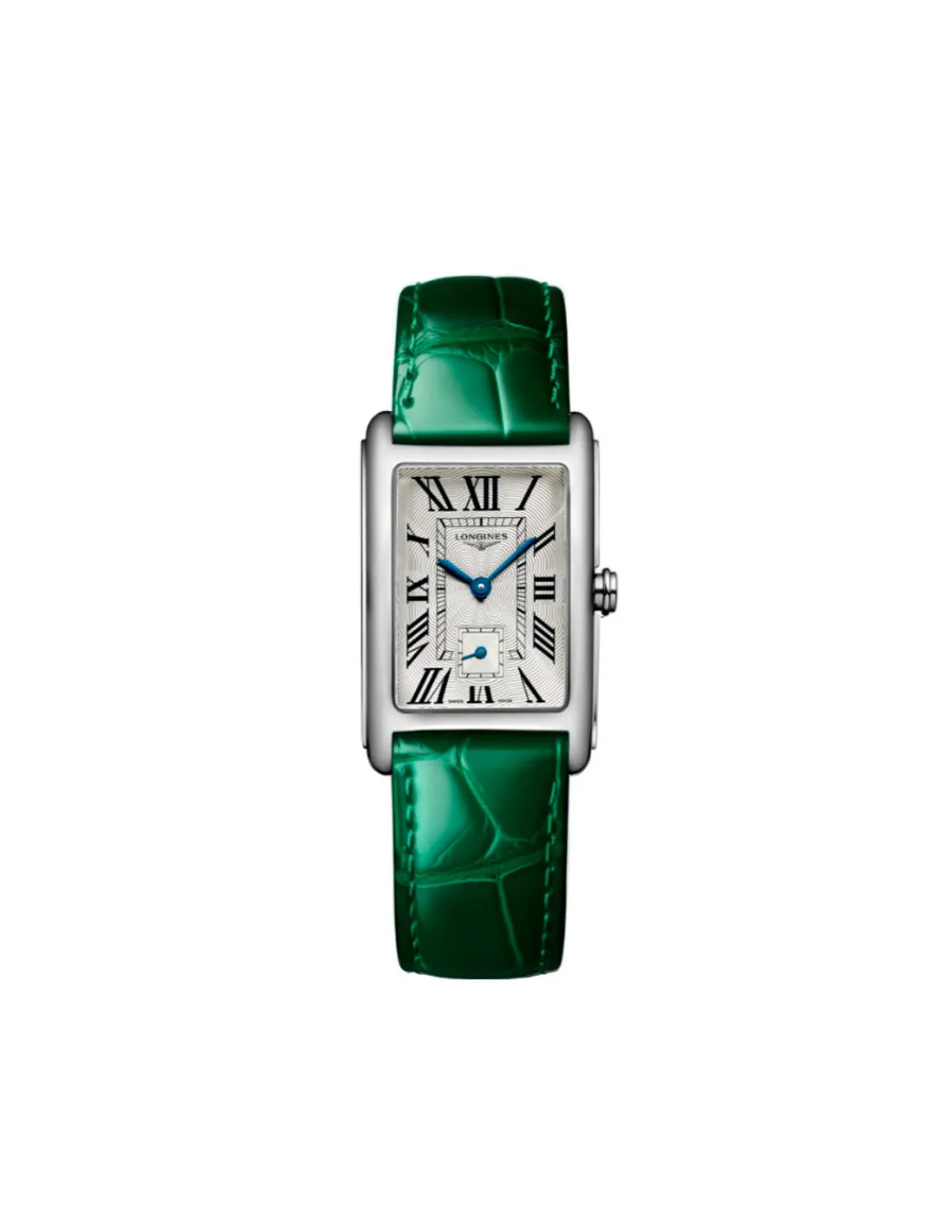 Reloj Longines DolceVita L5.512.4.71.A para mujer con caja rectangular de acero, esfera plateada flinqué y correa de piel de aligátor color verde. Movimiento de cuarzo Swiss Made.