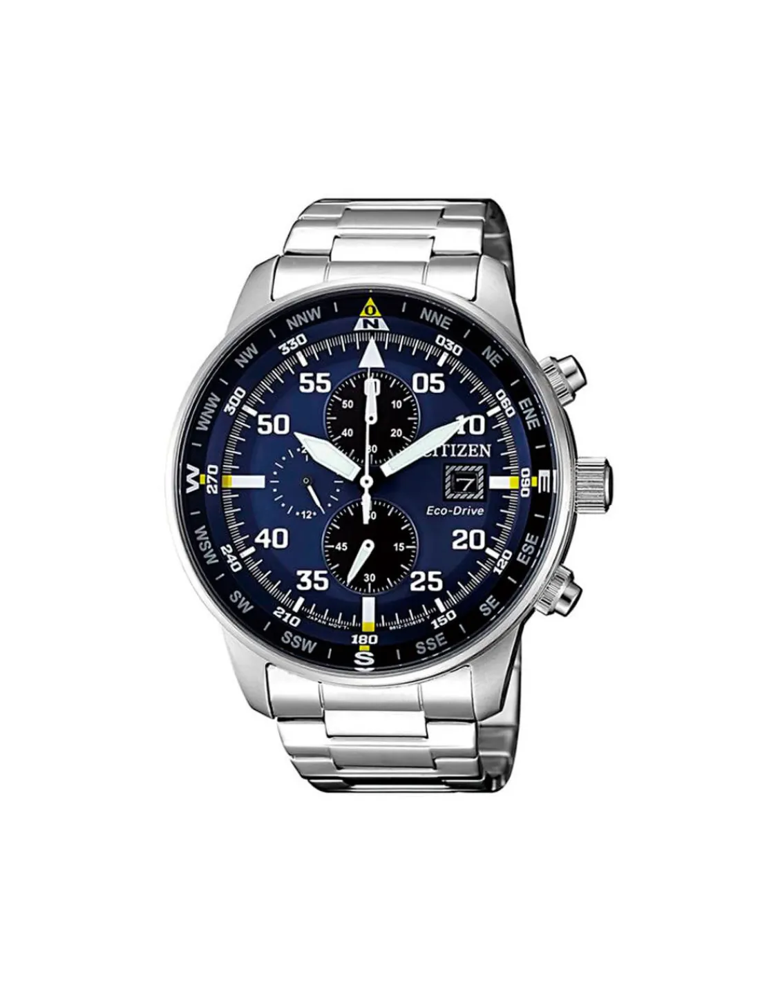 Reloj Citizen Eco Drive Crono Aviator para hombre con caja de acero de 44 mm, esfera azul y brazalete de acero. Movimiento Eco Drive con Cronógrafo 60 minutos a 1/5 de segundo y taquímetro interno. Un reloj deportivo con una bonita esfera azul que le aporta un toque elegante a la vez que informal.