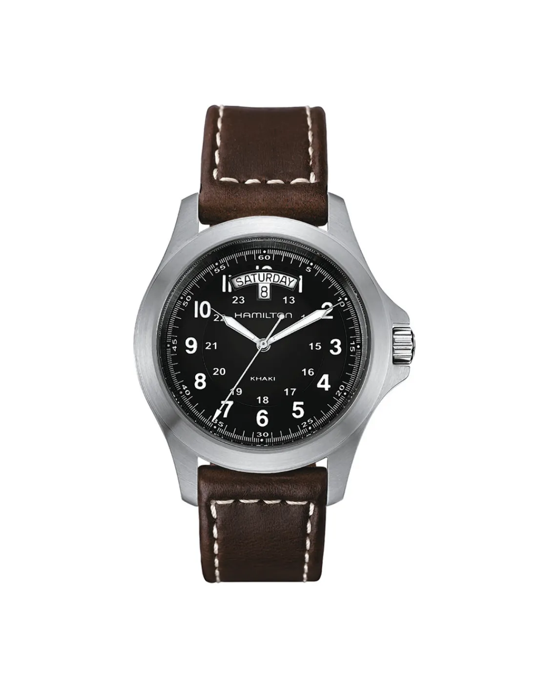 Reloj Hamilton Khaki Field King con caja de acero de 40 mm, esfera negra con números árabes color blanco y agujas luminiscentes acompañada de correa de piel marrón. Un reloj equipado con protectores diseñados para garantizar la seguridad de la corona en cualquier circunstancia. Movimiento de cuarzo Swiss Made.
