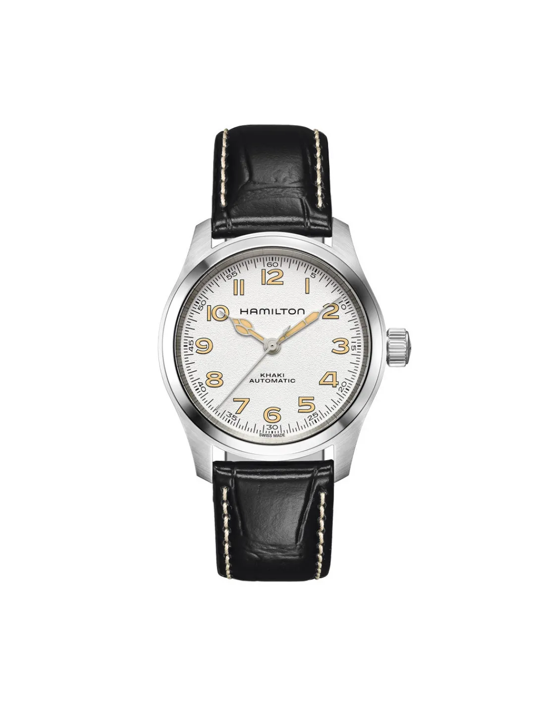 Reloj Hamilton Khaki Field Murph con caja de acero de 38 mm, esfera en blanco envejecido con acabado granulado combinada con agujas tipo catedral y correa de piel de becerro negra. Este reloj cautiva a los seguidores de los relojes más pequeños. Movimiento automático H-10 Swiss Made con 80 horas de reserva de marcha.