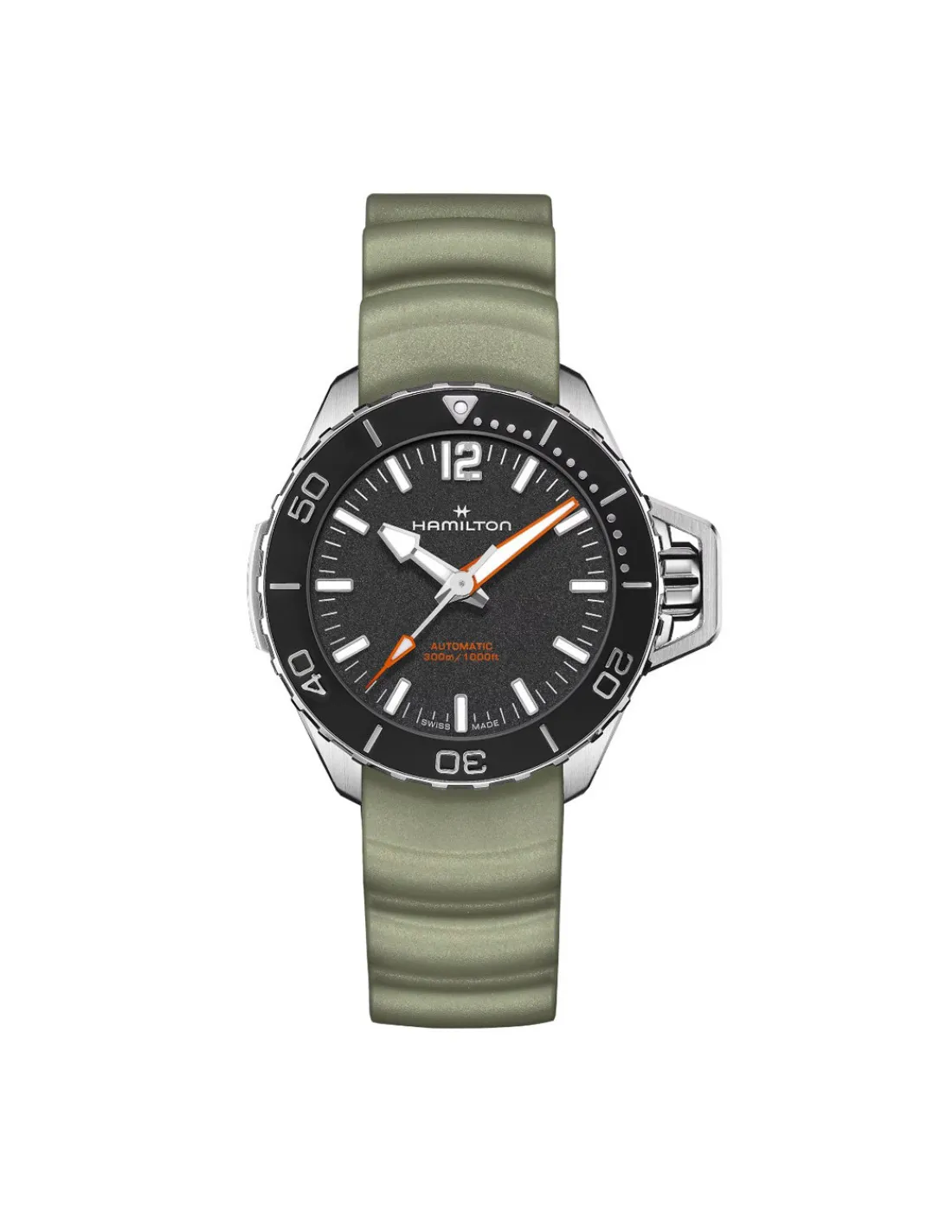 Reloj Hamilton Khaki Navy Frogman Auto H77455331 para hombre con de acero, esfera negra y correa de caucho verde. Un reloj que destaca por su rendimiento técnico y su diseño distintivo con movimiento automático Swiss Made y 80 horas de reserva de marcha.