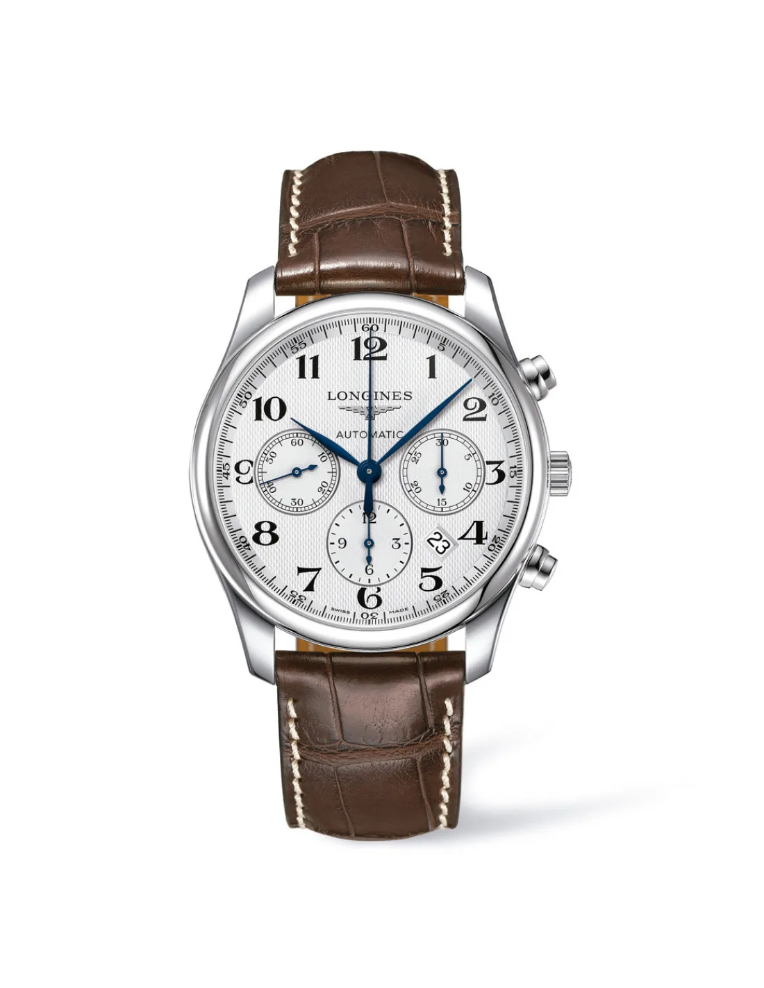 Reloj Longines Master Collection para hombre con caja de acero de 42 mm de diámetro, esfera plateada con números árabes y agujas de color azul acompañado de correa de piel de caimán marrón. Un reloj con movimiento automático cronógrafo Swiss Made con segundero central de cronógrafo, contador de 30 minutos a las 3 horas y contador de 12 horas a las 6. Reserva de marcha de 60 horas aproximadamente.